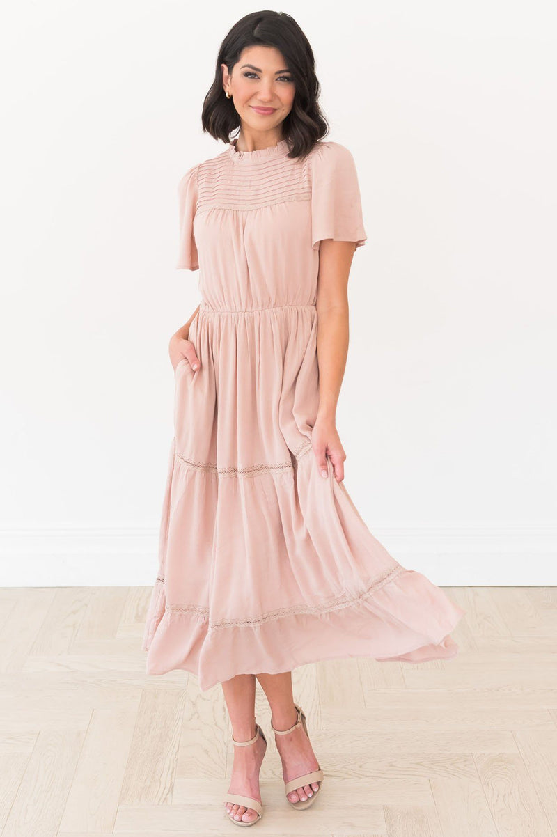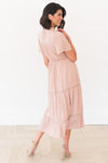 Wow! Welcome our gorgeous new Antonina Maxi Dress! This beautiful sand colored dress has so many stunning features, such as a high ruffled neckline, short flutter sleeves, a tiered skirt, and lace embroidery on the neckline and skirt! This dress is a must have for summer!