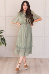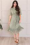 This darling sage and ivory colored dress is perfect from top to bottom! The darling ruffle skirt detailing, flowy bell sleeves, and tie-waist is creating such a trendy and modest gown! We just adore this delicate floral pattern too!
