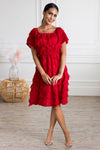The gorgeous Arava is a showstopper! We are so in love with the stunning red color, feminine modest fit and gorgeous fringe detailing, we simply can not get enough! Also features, lovely ruffle bodice creating flattering flutter sleeves, elastic waistline and perfect length fluttery skirt. Get yours today!