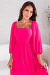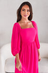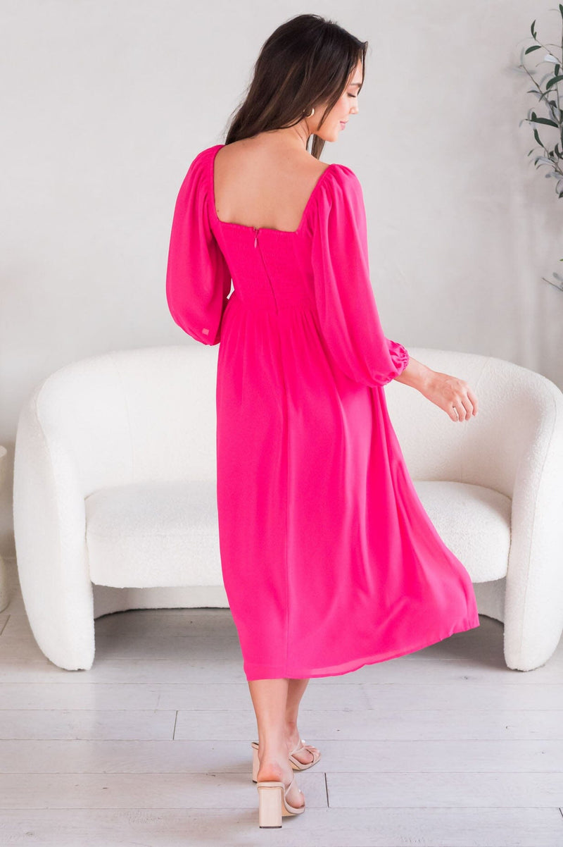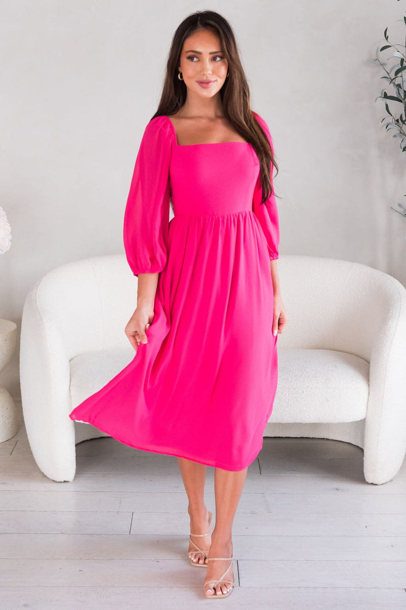 If you have been on search for the perfect chiffon dress for all your upcoming special occasions, look no further! Our new, modest, Ari Dress, is the one for you. Featuring a square neckline, beautiful quarter length puff sleeves, and a flowy tea-length skirt.