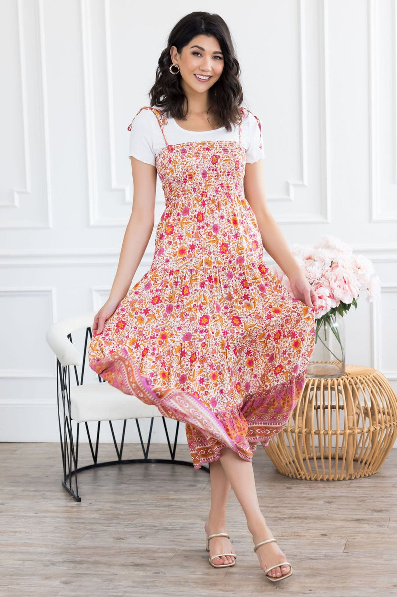 The new Krystelle is a real stunner! This lovely flowy perfect for Summer jumper is a wardrobe must have! Features include feminine tie shoulder straps, smocked bodice and a gorgeous flowy tiered skirt. Get yours today, these beauties won't last long!