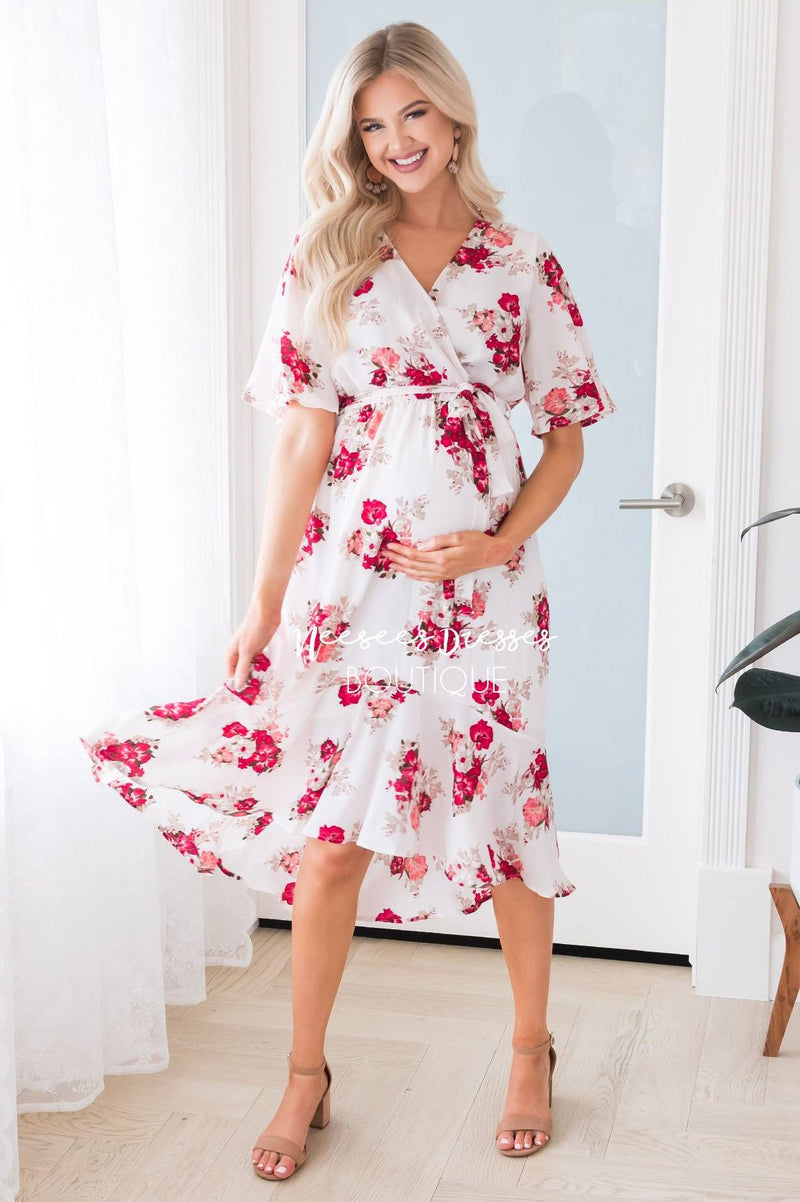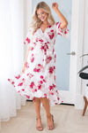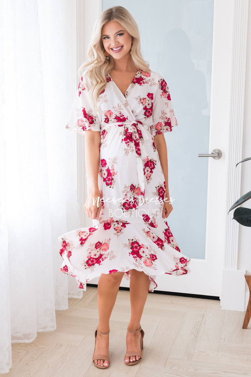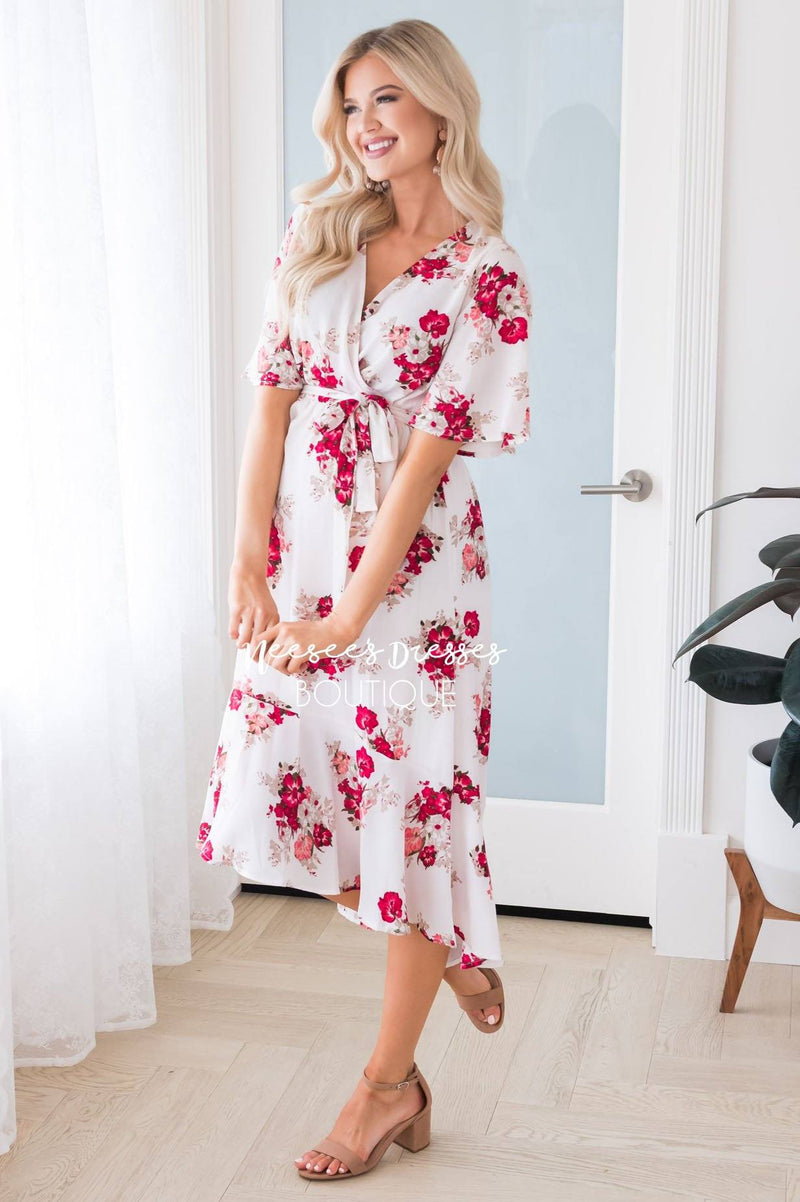 Talk about a catch, the New Arya is one for sure! Featuring lovely flowy half flutter sleeves, cross-over bodice, elastic belt tie waist and our favorite feature of all, the feminine ruffle high-low hemline. This modest beauty is a must have!