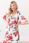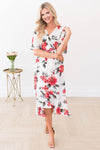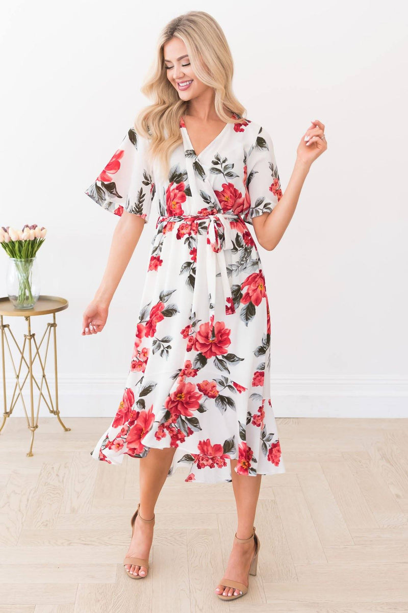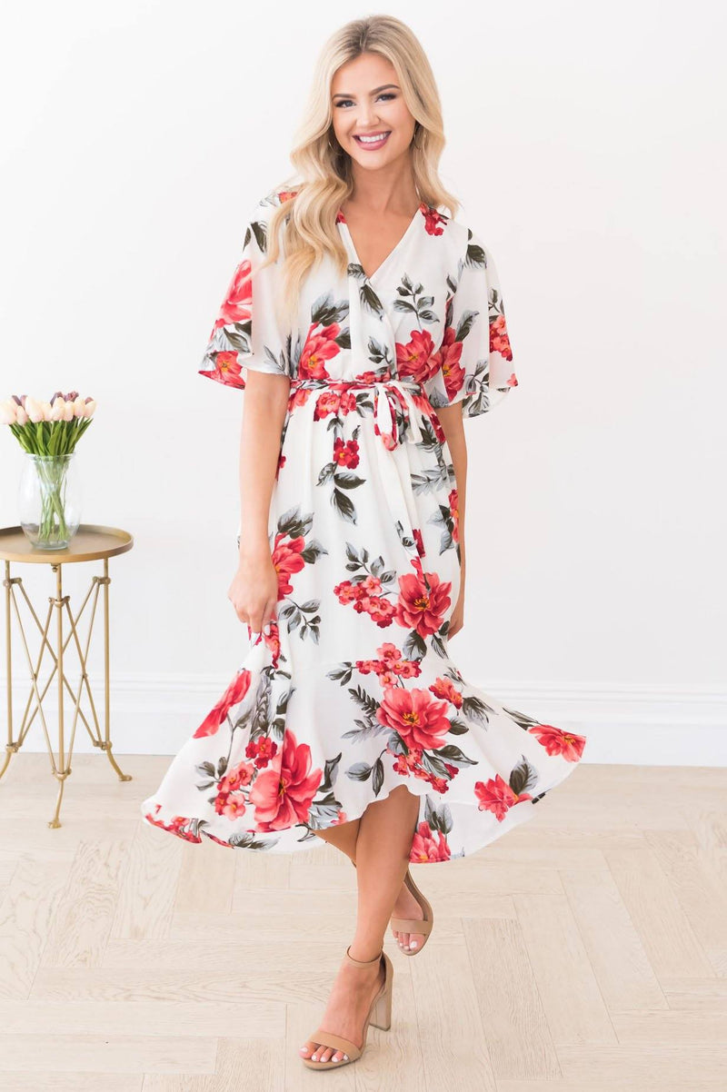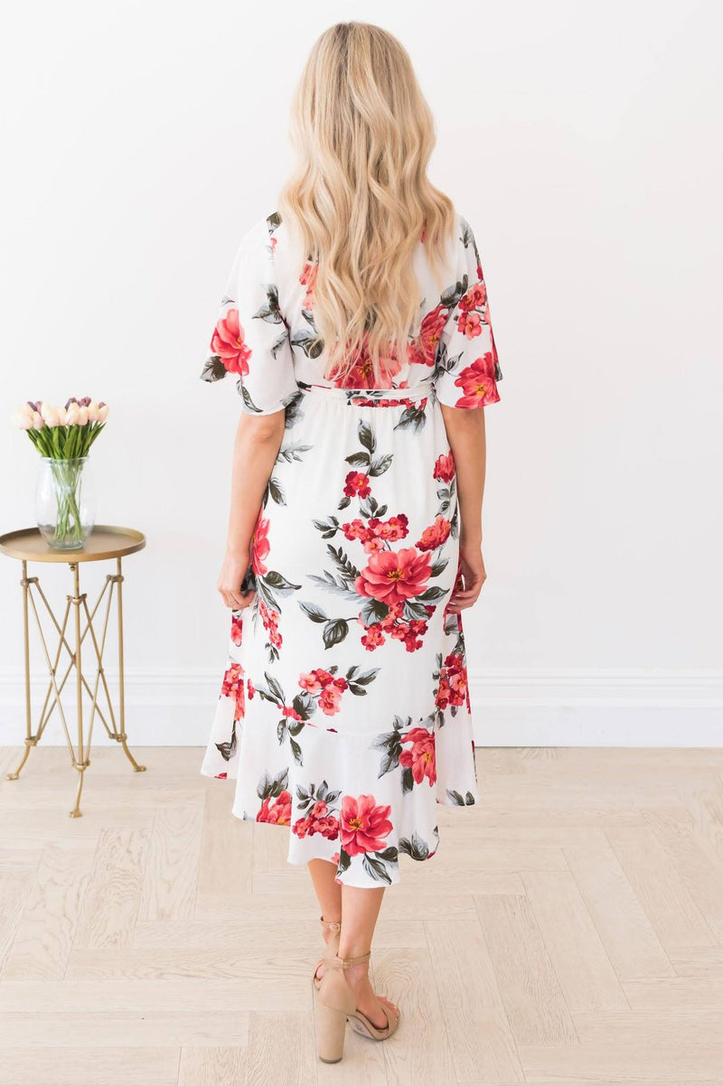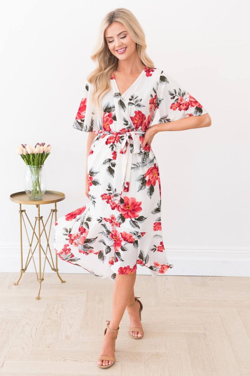 Talk about a catch, the New Arya is one for sure! Featuring lovely flowy half flutter sleeves, cross-over bodice, elastic belt tie waist and our favorite feature of all, the feminine ruffle high-low hemline. This modest beauty is a must have!