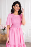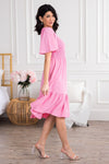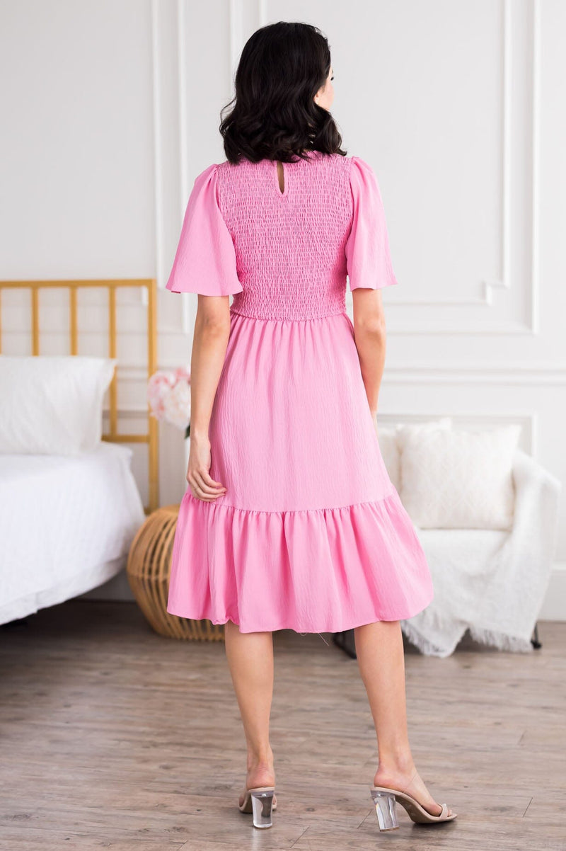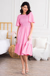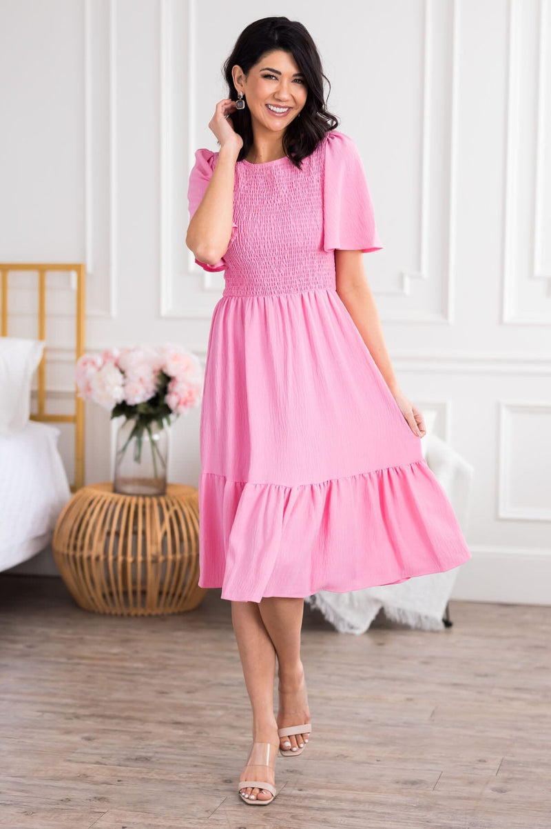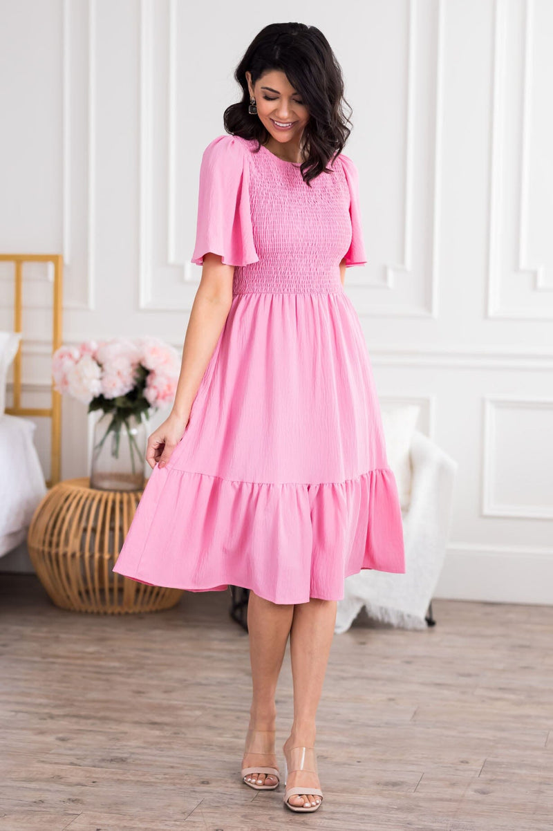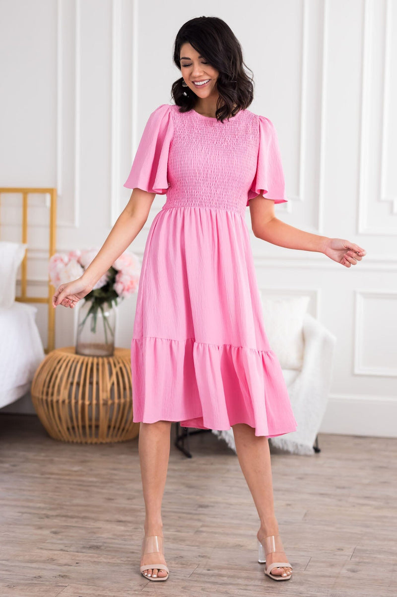 Flutter sleeves steal our heart every time and the new Ashanta is no exception! This gorgeous mid-length dress features a modest round neckline, classy smocked bodice and last but definitely not least the darling ruffle hem skirt! These will go quick, get yours before they are gone!
