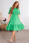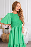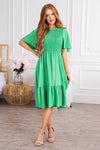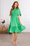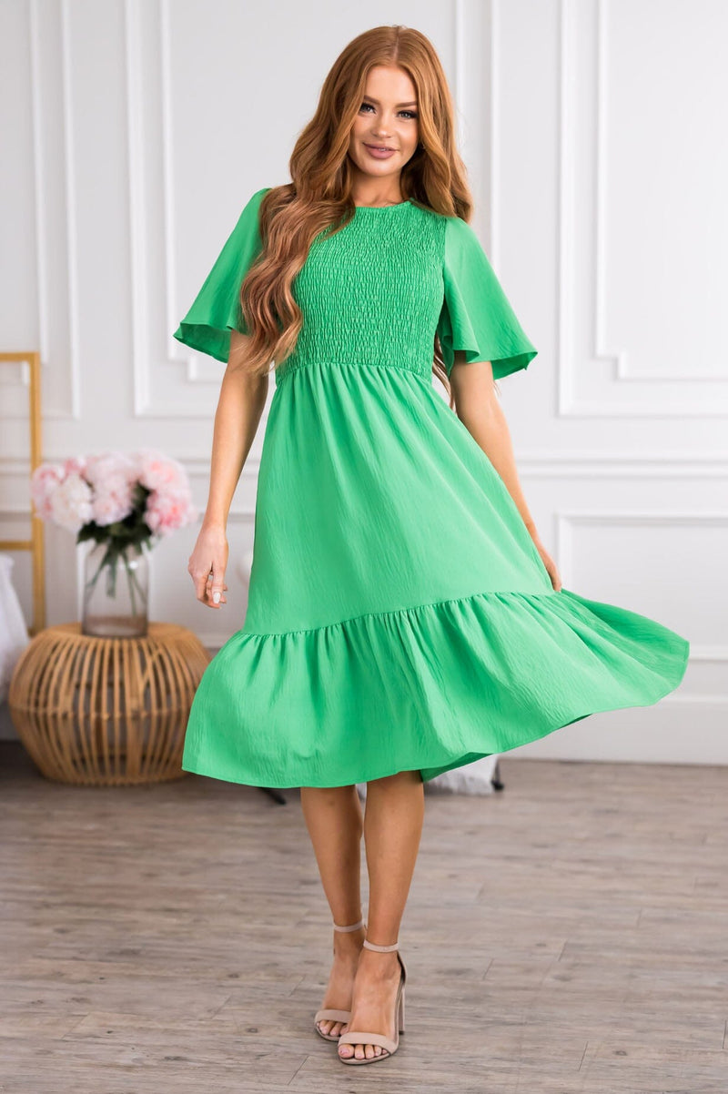 Flutter sleeves steal our heart every time and the new Ashanta is no exception! This gorgeous mid-length dress features a modest round neckline, classy smocked bodice and last but definitely not least the darling ruffle hem skirt! These will go quick, get yours before they are gone!