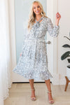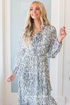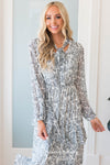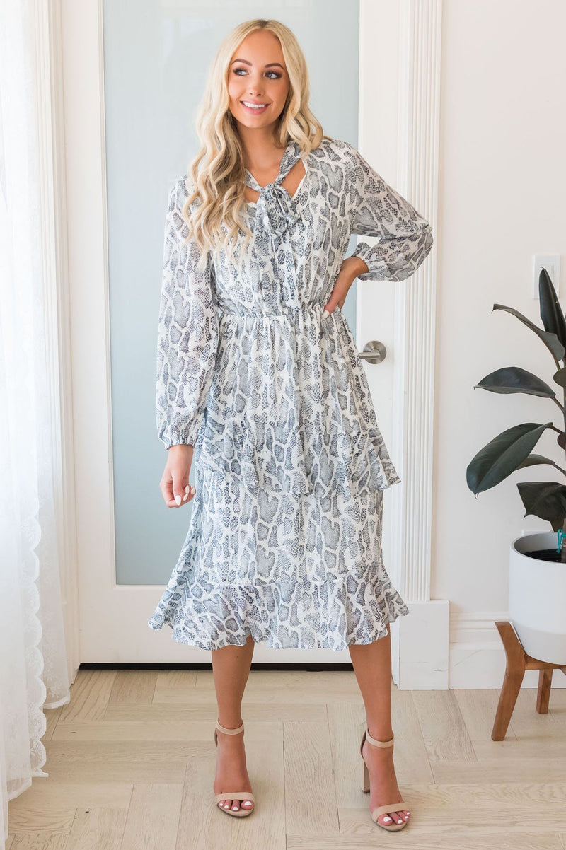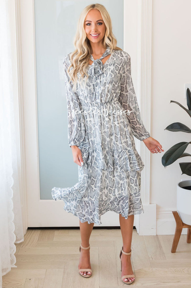 This is our newest favorite! We can not get over the stunning snake skin print and all those flowy ruffles! Also features a modest v-neckline with choker tie detail, long sleeves, elastic waist and the skirt is lined.