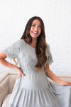 A new gorgeous dress is here to steal the show! We are obsessed with the gorgeous lace sleeves on this beauty! This dress features a round neckline, keyhole button closure, flowy tiered skirt, lovely cool grey color, and lace detailing on the middle of the bodice!! This is going to be perfect for any occasions you have coming up in your life!