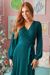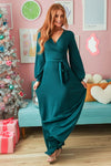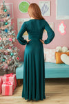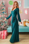 We can't put into words how beautiful this new hunter green dress is! This new, modest, maxi dress features a nursing friendly cross-over bodice, long cuffed sleeves, and a cute tie waist detail.