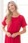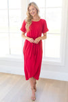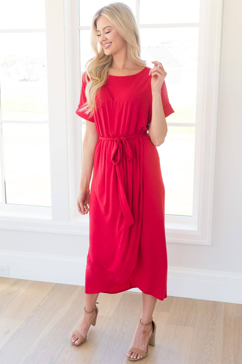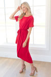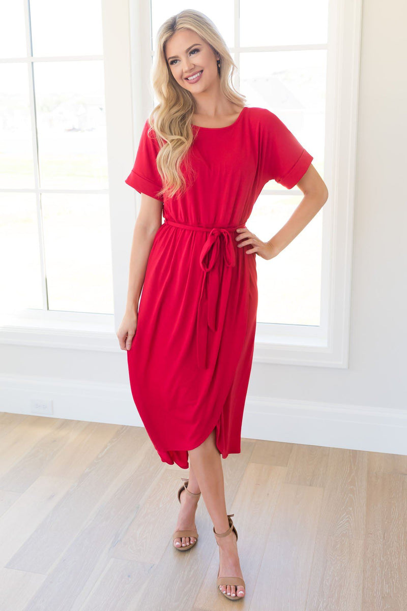 We run out of flattering words to use when describing the new Asia Dress! It's so comfortable and easy to wear, the perfect addition to everyone's closet. Featuring a rounded neckline, short cuffed sleeves, belt tie waist and high/low wrap style skirt. Just say yes to the dress and get it today!
