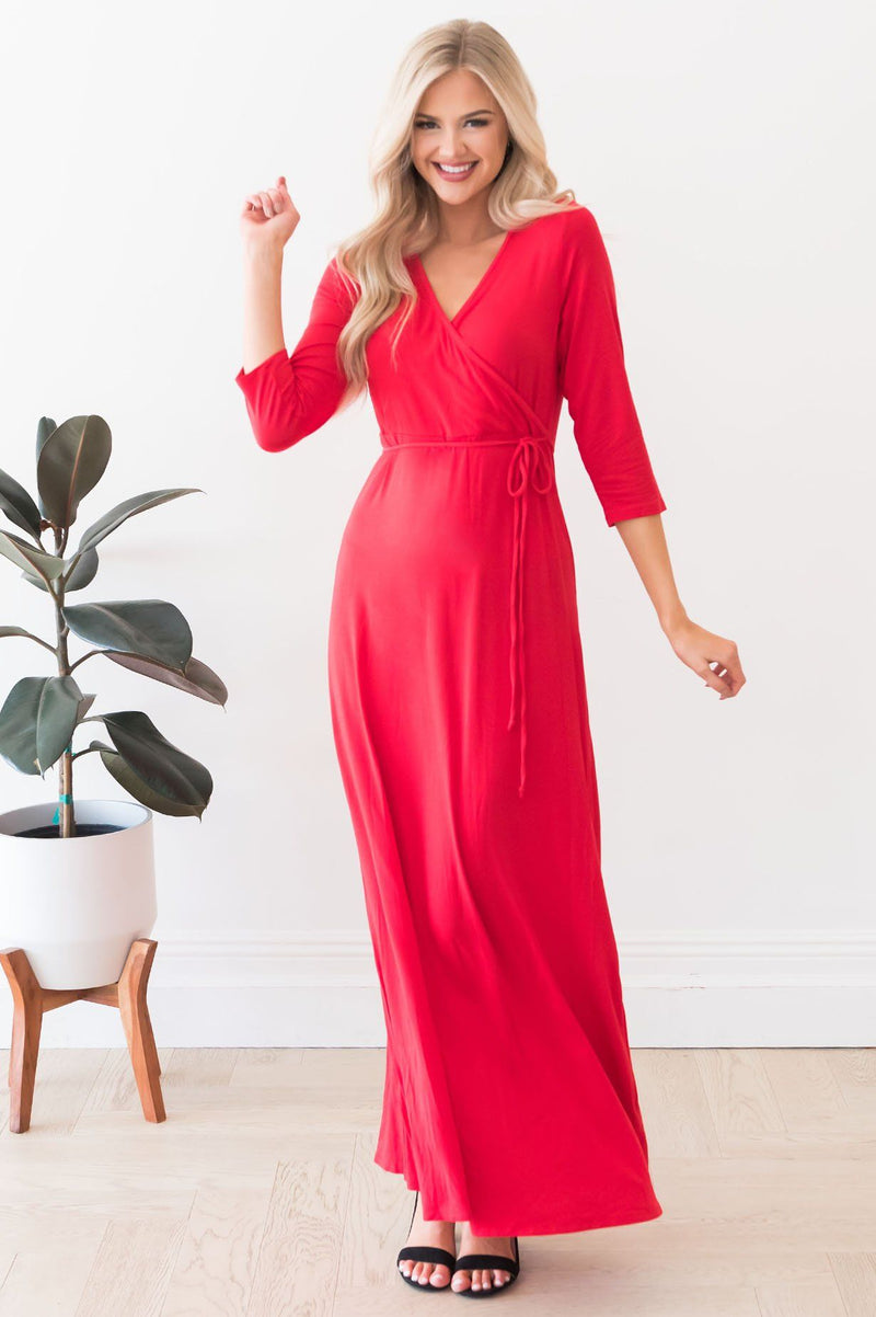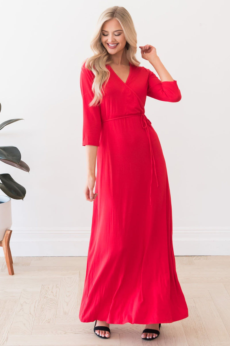 The darling Attina is the absolute perfect dress! Soft feel, rich color, feminine fit, perfect everything! Featuring a cross-body bodice, 3/4 length sleeves, belt tie waist and flowy maxi skirt length. This modest beauty is for everyone with it's soft stretch fabric and fit, get yours before they're gone!