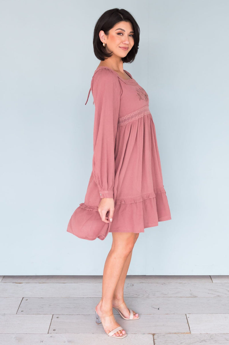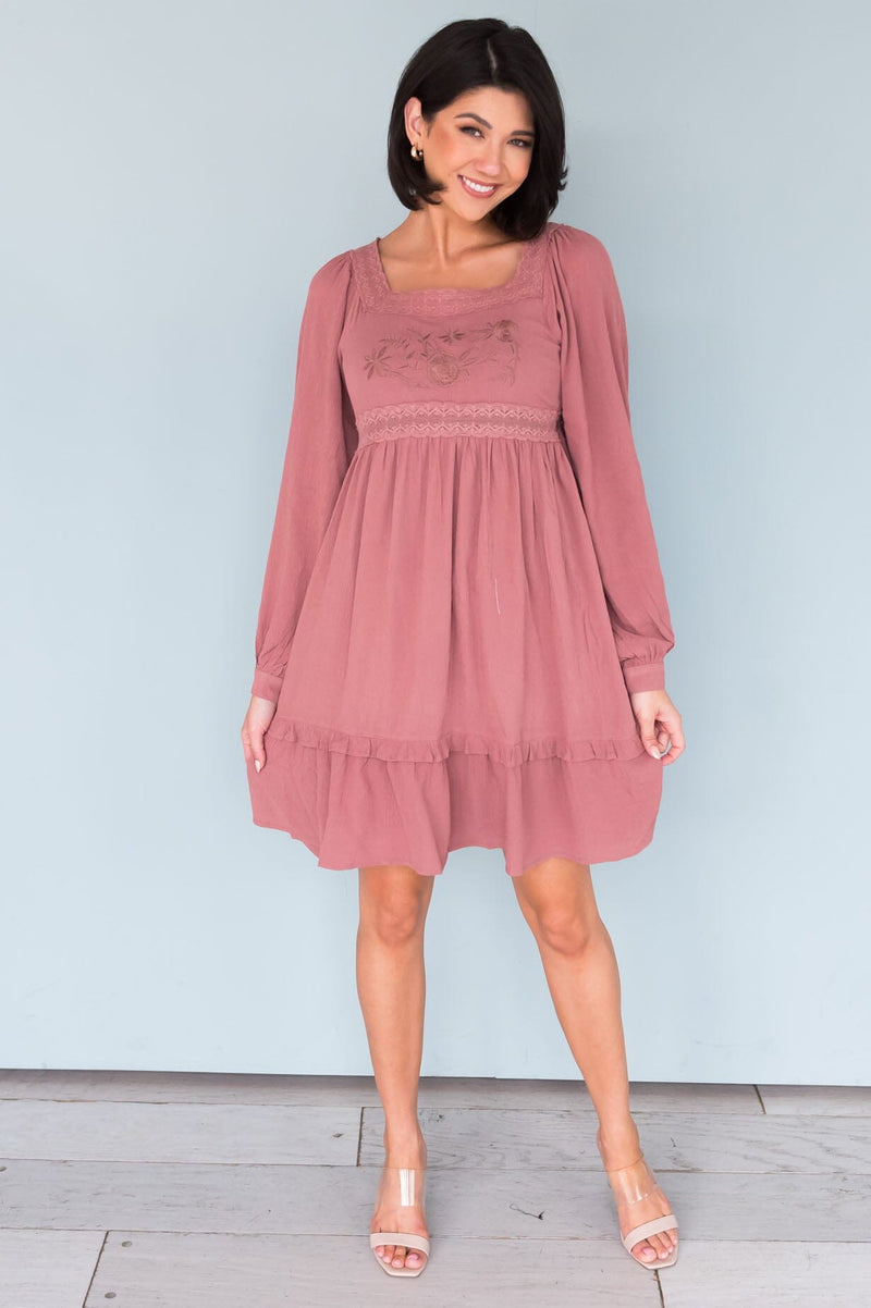 The darling petite Aunika is oh so feminine it's an absolute must have for every wardrobe! The cuffed long sleeves, stunning lace and embroidery detailing with a flowy ruffle hem skirt are the the perfect combination. Get yours today!