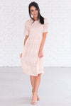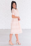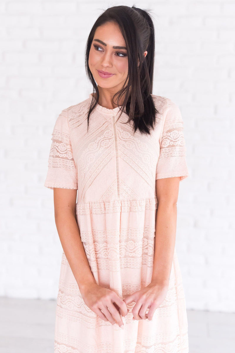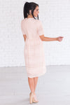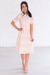 Spring is right around the corner and the Auranna is here to help you welcome in the new season in style! Featuring the most darling delicate lace detailing throughout this gorgeous dress, short unlined sleeves, zipper back closure and the perfect modest length skirt around. Get yours before these are gone!