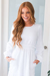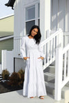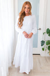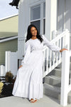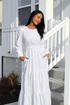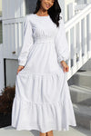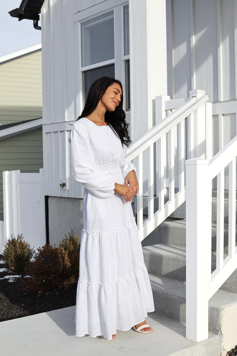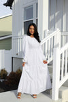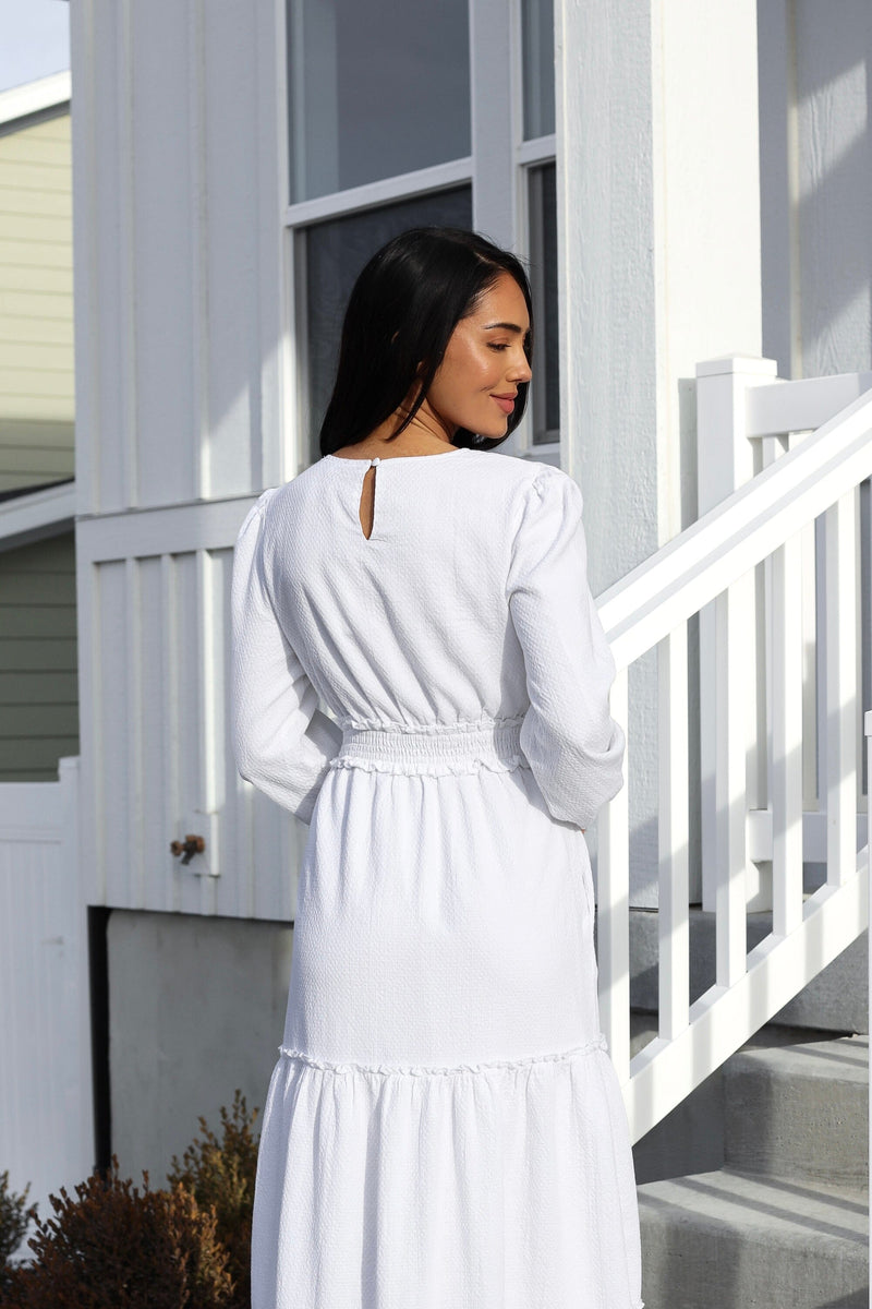 This textured beauty is a must have! Dress features include a ruffled smocked band waistline, soft round neckline, keyhole button closure, pockets, a twirl worthy tiered maxi skirt & simple long sleeves. You are not going to want to miss out on our lovely Aurielle!