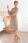 We've got the best new classic modest go to dress for you! The Austine features long sleeves, the most delicate feminine shinny golden taupe color, soft v-neckline with faux button detailing on the bodice, an elastic tie feature waistline and a flowy mid-length skirt. Get yours today, these beauties won't last long!