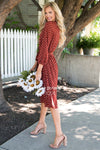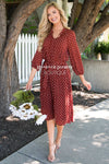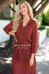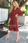 We adore a pleated skirt! This adorable mid-length dress has all the best features, soft v-neckline with tie, belt tie waist, 3/4 length puff sleeves and last but definitly not least a beautiful rust color with patterned cream and blue dots. A must have for your wardrobe!
