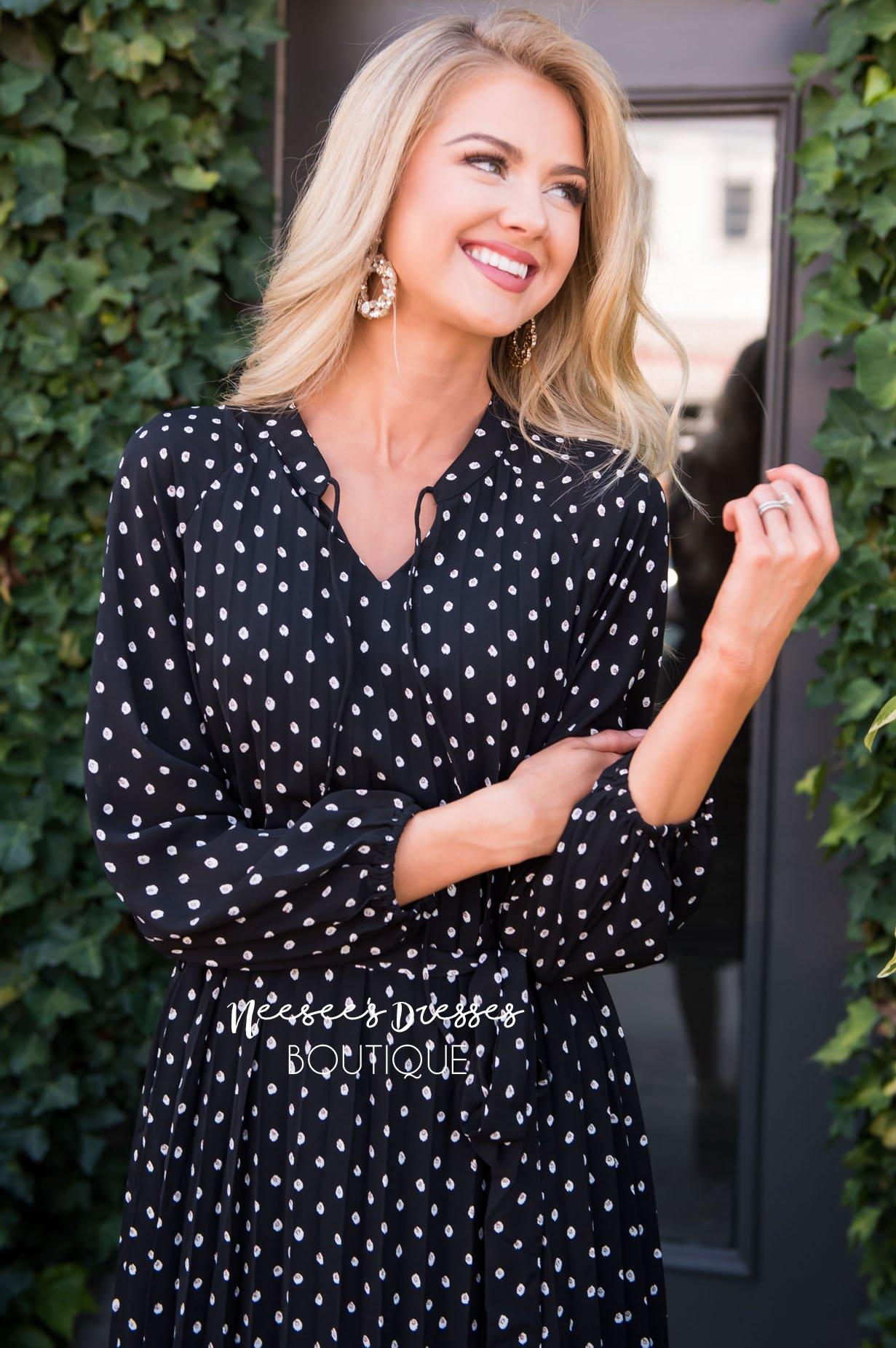 We adore a pleated skirt! This adorable mid-length dress has all the best features, soft v-neckline with tie, belt tie waist, 3/4 length puff sleeves and last but definitely not least a classic black color with patterned cream and rust dots. A must have for your wardrobe!