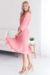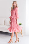 We adore a pleated skirt! This adorable mid-length dress has all the best features, soft v-neckline with tie, belt tie waist, 3/4 length puff sleeves and last but definitely not least a feminine classy peony pink pleated material. A must have for your wardrobe!