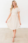 The Avely is here and ready for anything! We know the fabulous cream an ivory are just so classy! The swiss dot like material and the sensational design elements make this dress on you don't want t to miss out on! The lace floral collar, functional button down bodice, cap sleeves, and embroidery empire waist detailing!