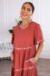 The Avrilene is one of the classiest dresses we have ever seen! Twirl your way into any season or event with this lovely terracotta beauty. Featuring a modest round neckline, short flutter sleeves, embroidery details throughout, pockets and the perfect length tiered skirt.