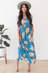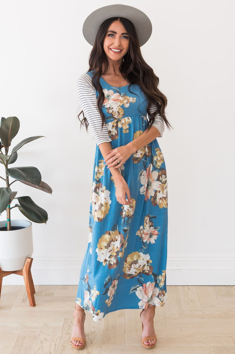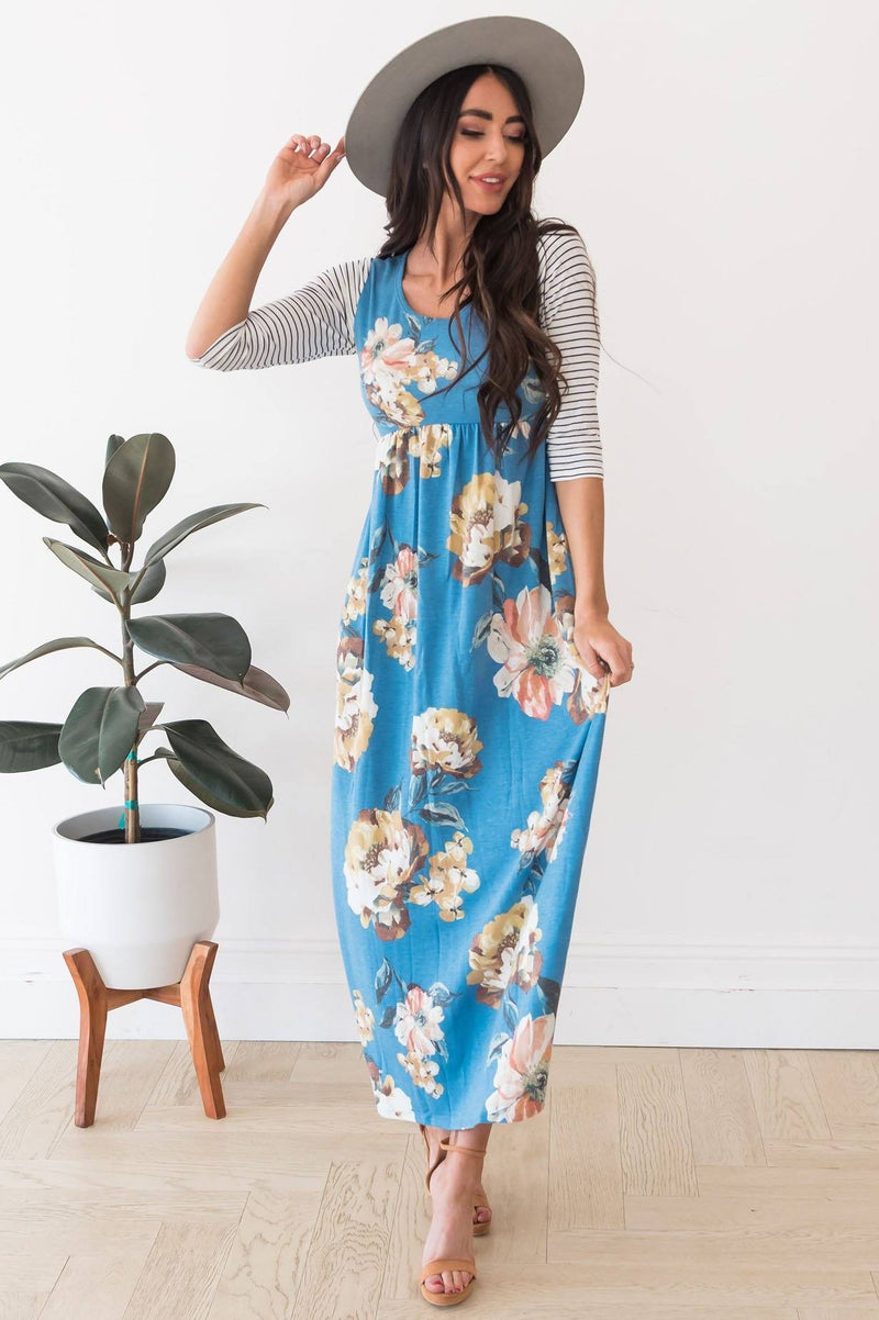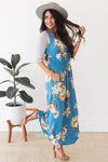 The Barbri has arrived and we couldn't be more excited! This lovely flowy maxi has all the best features to include, classy striped 3/4 length sleeves, long flowy maxi skirt with pockets in the most elegant cobalt floral. Get yours before they are all gone!