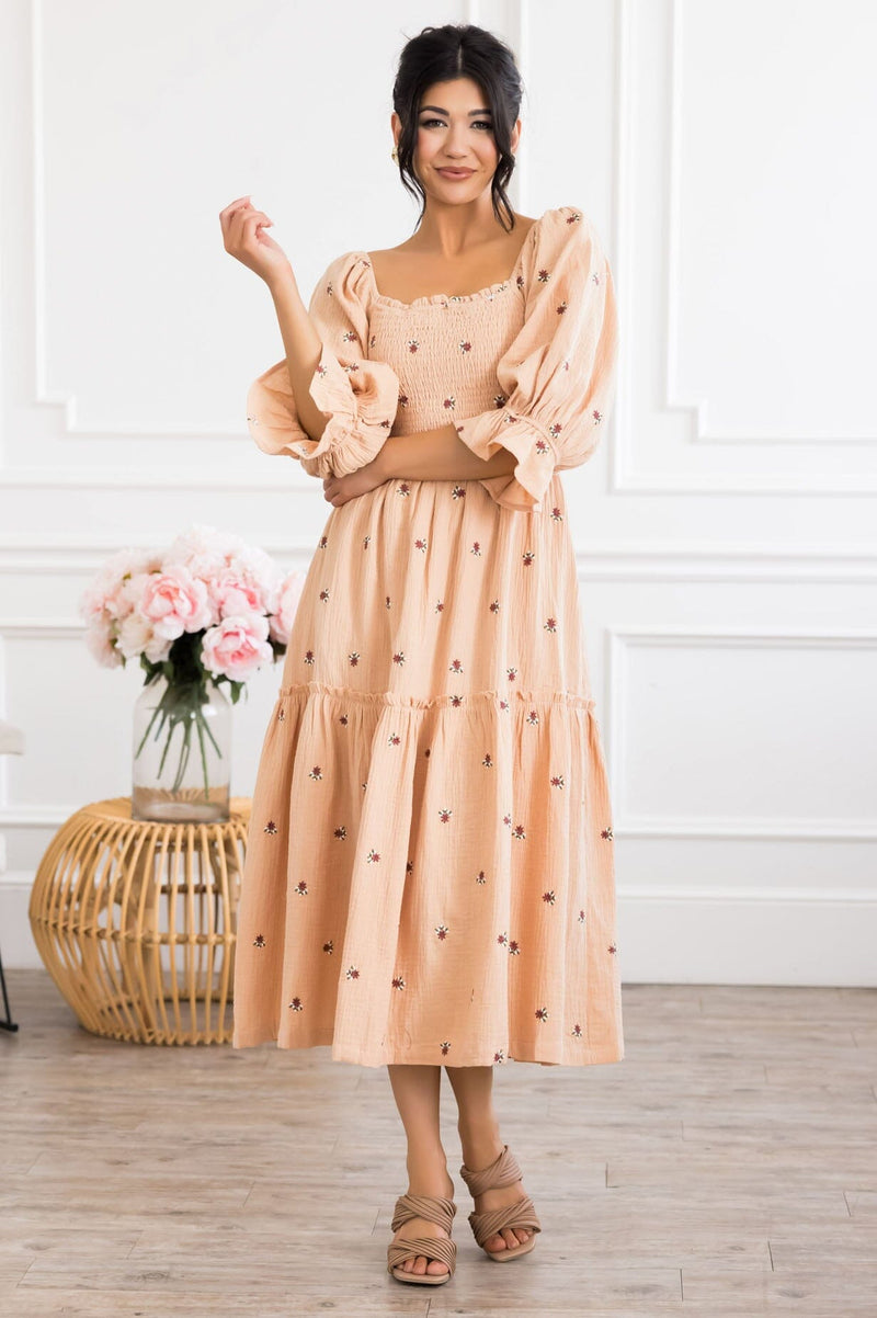 Prepare to have your breath taken away! The perfect dress *does* exist: Meet our modest Bates Dress. This breathtaking dress features a square neckline, gorgeous quarter length ruffled sleeves, smocked bodice for a comfortable fit, a drop ruffle hem and the loveliest floral embroidery detailing, it is simple yet so delicate!
