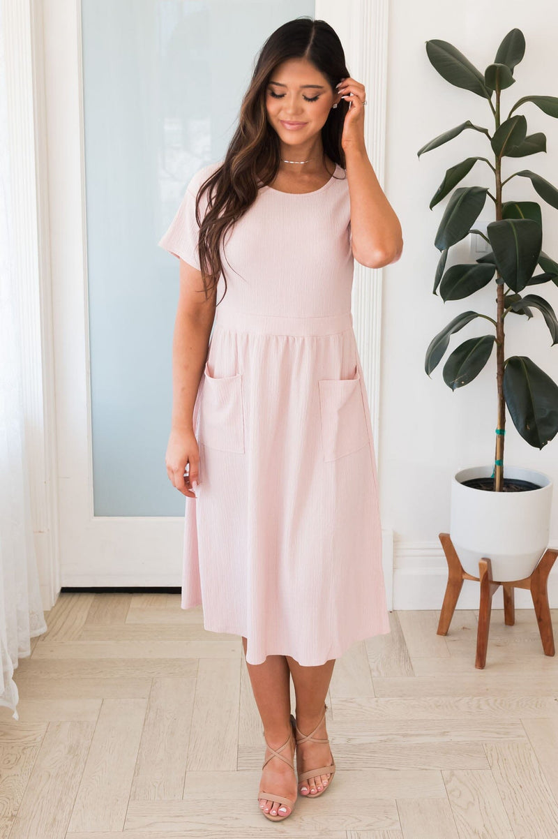 We are in love with perfect for all Beata dress! This gorgeous modest beauty, is a true must have! Featuring a modest round neckline, short sleeves, pockets and perfect length skirt. Get yours today!