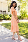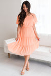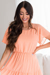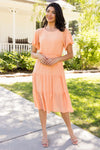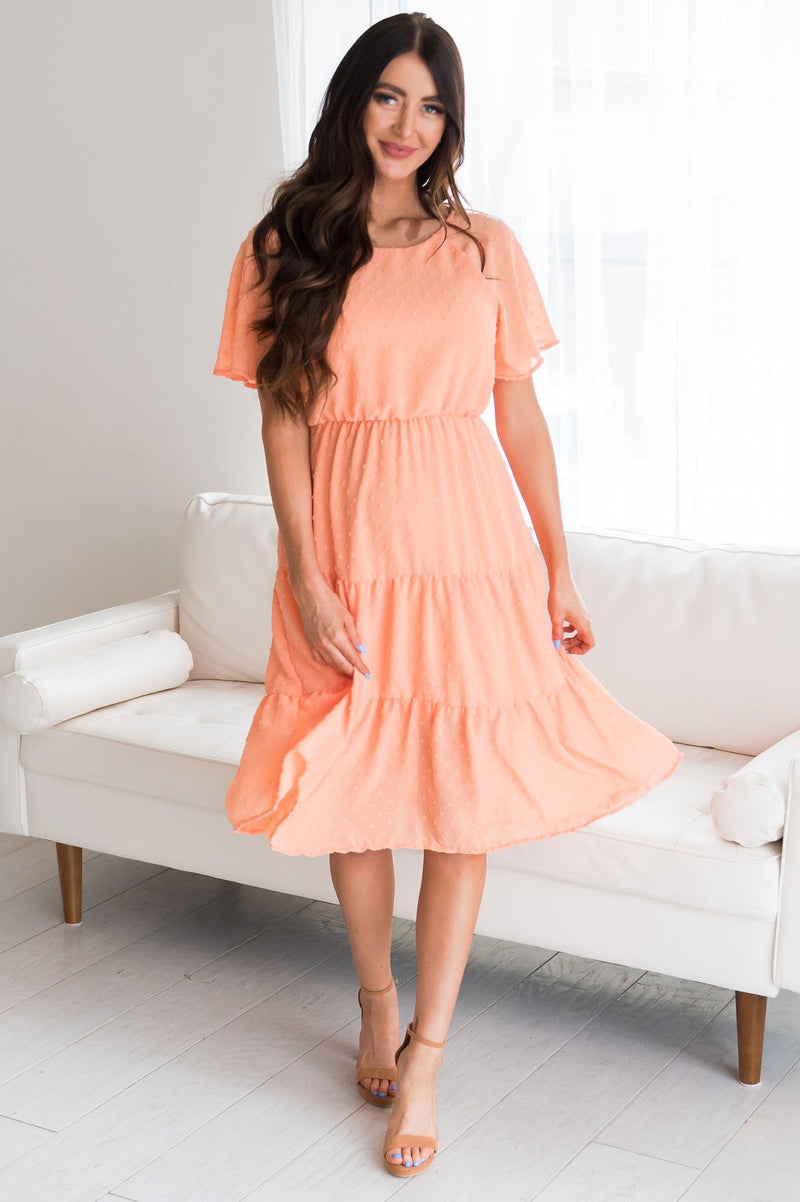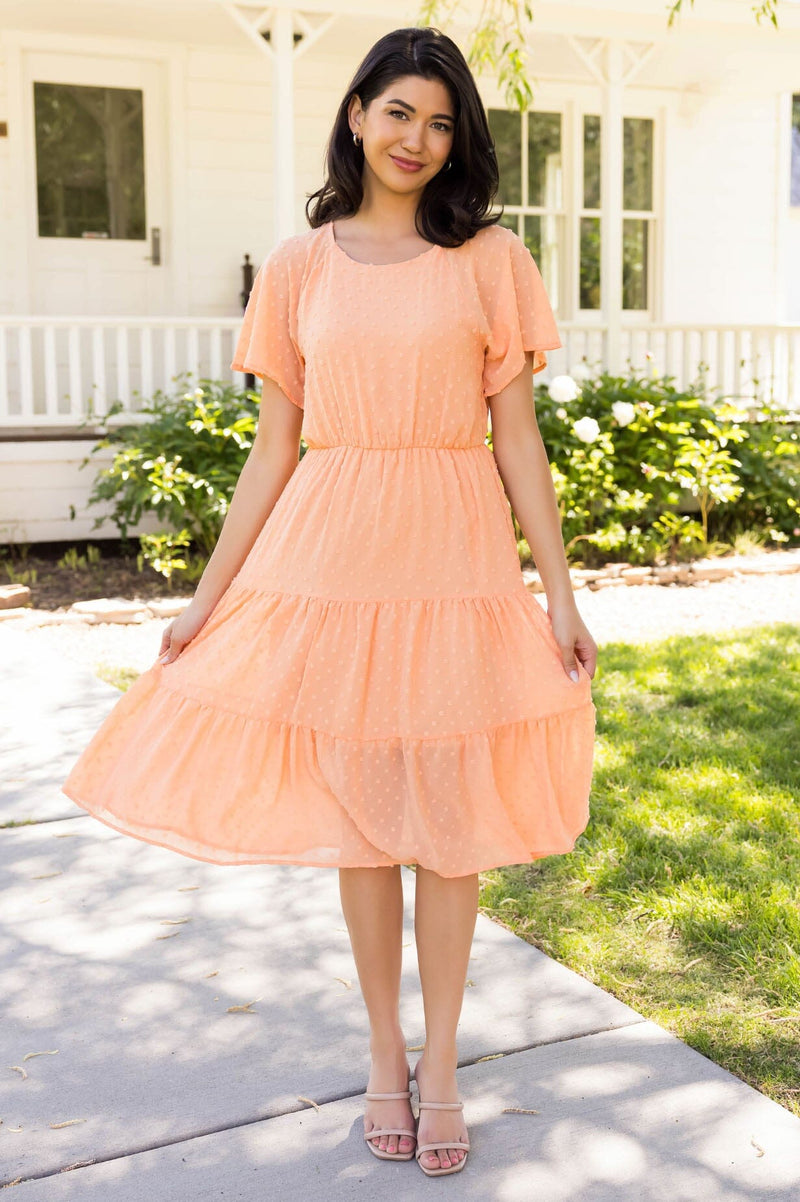 Guess what?! Your new favorite swiss dot dress has arrived and we are so excited! Featuring such a classy feminine tiered flowy skirt, elastic waist, modest rounded neckline and short flutter sleeves. Get yours before they are all gone!