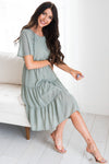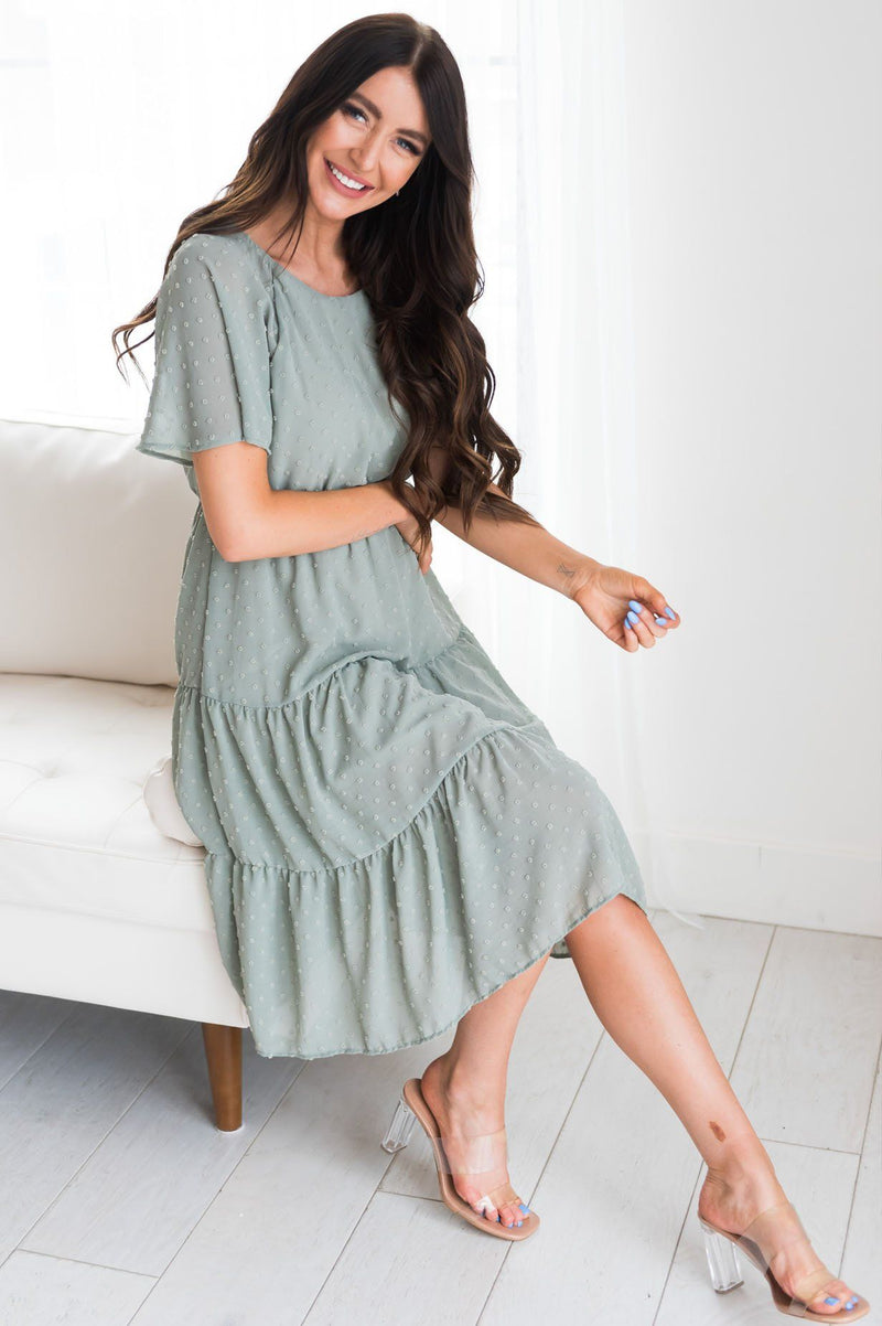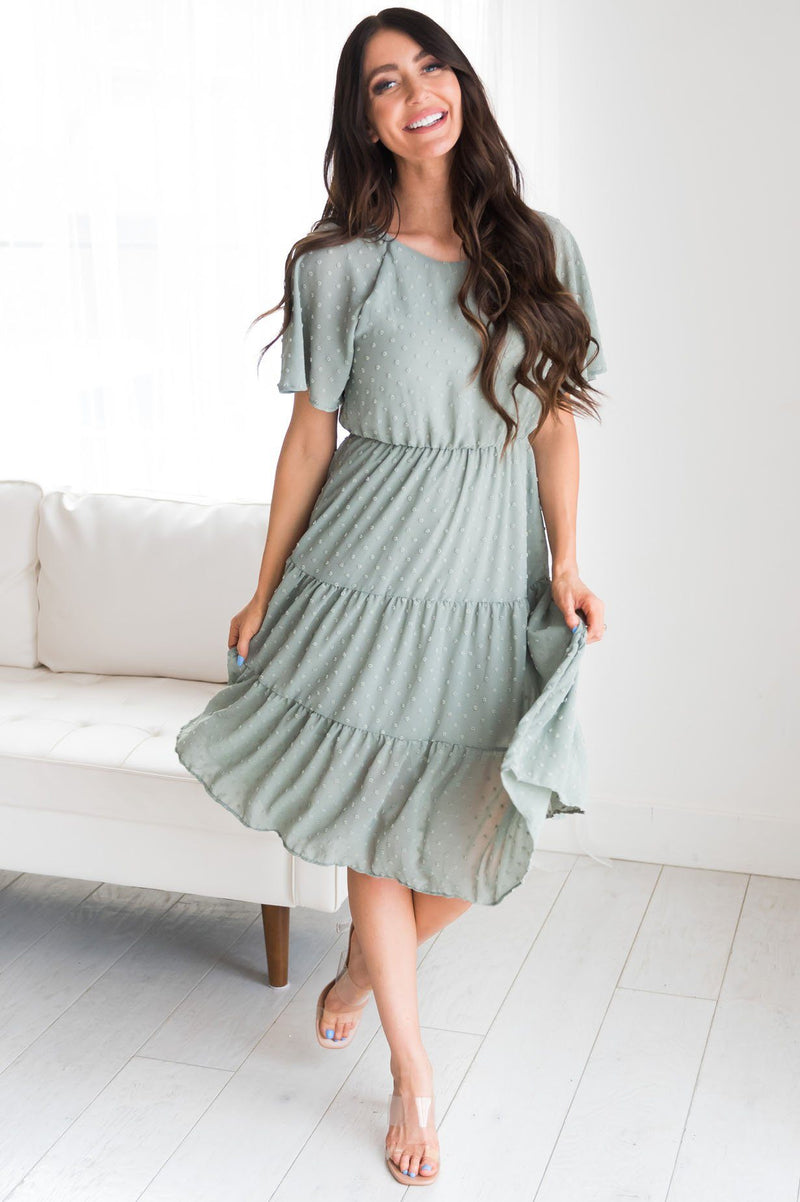 Guess what?! Your new favorite swiss dot dress has arrived and we are so excited! Featuring such a classy feminine tiered flowy skirt, elastic waist, modest rounded neckline and short flutter sleeves. Get yours before they are all gone!