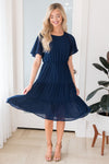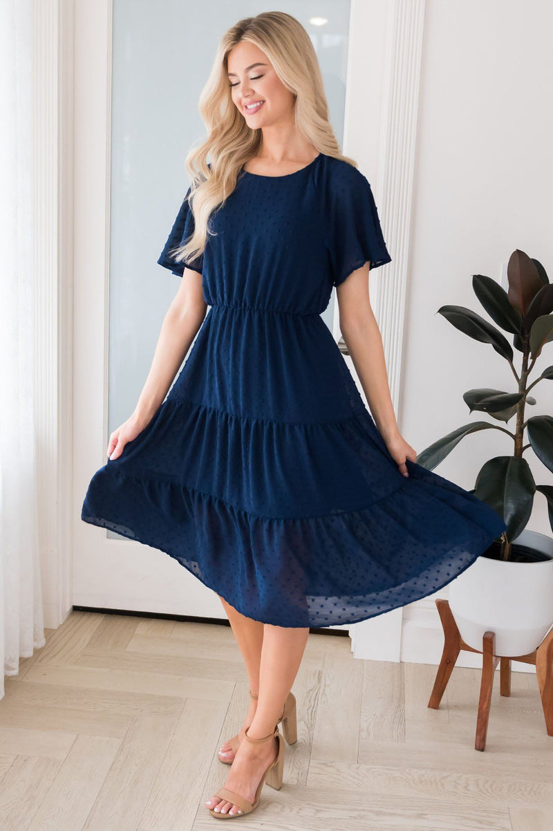 Guess what?! Your new favorite swiss dot dress has arrived and we are so excited! Featuring such a classy feminine tiered flowy skirt, elastic waist, modest rounded neckline and short flutter sleeves. Get yours before they are all gone!