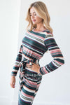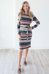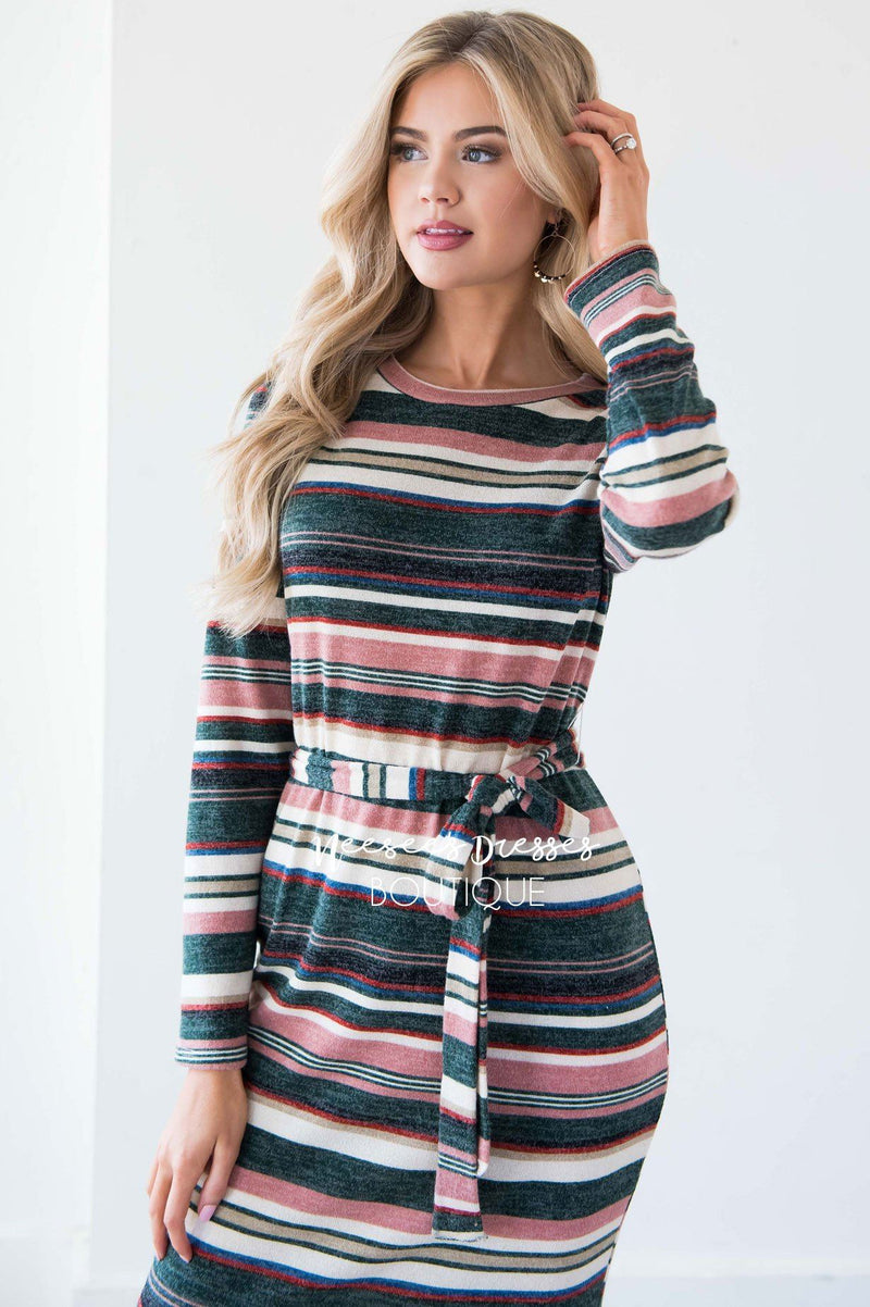 The Becca is so beautiful and so comfortable! Perfect for everyday wear, or perfect for dressing up, this sweater dress will take you from winter to spring seamlessly! Gorgeous long sleeve dress features a tie waist sash and a dusty pink, emerald, oatmeal and cream stripe print. Unlined, dress has stretch.