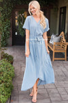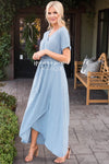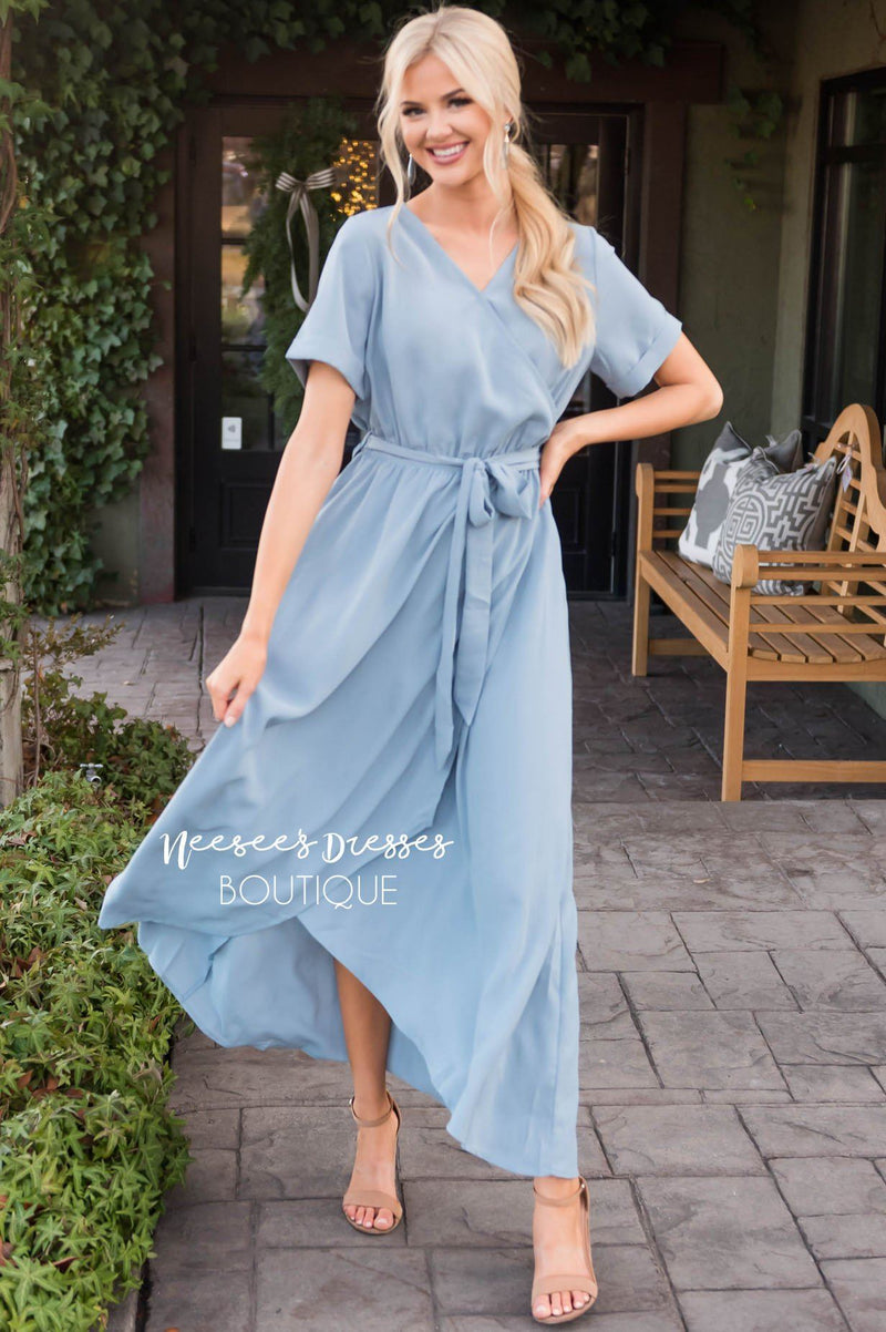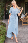 We are pleased to introduce you to the new Becka, it's so flowy and feminine, the perfect addition to everyone's closet! Featuring the ever popular cross-over bodice with a snap button closure for our nursing mama's out there. Additional features include short cuffed sleeves, elastic waist with belt tie and the loveliest high/low wrap style skirt. Just say yes to the dress and get it today!