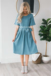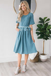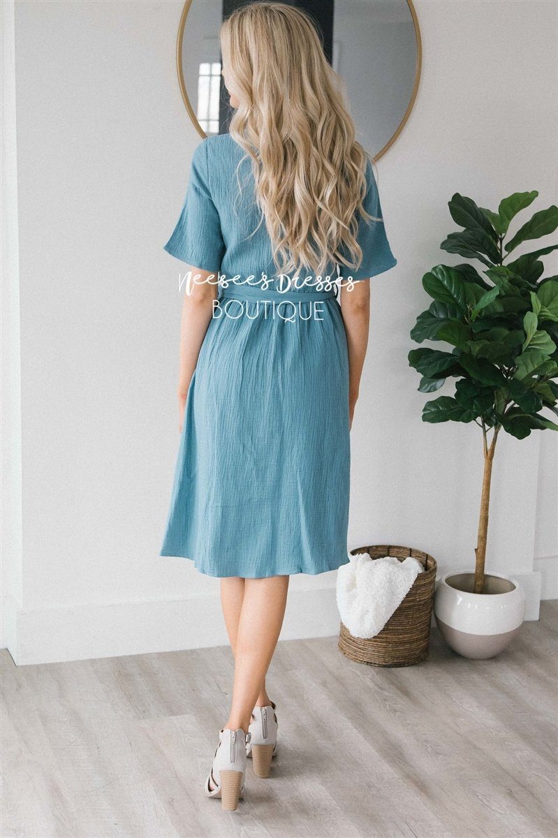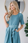 Hop into Spring in our new stunning Bella Dress! This dress features a dusty teal textured fabric that is to die for, a pleated waist with a side tie detail and keyhole button detail on the back. This dress is also fully lined with a side seam zipper!
