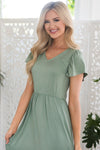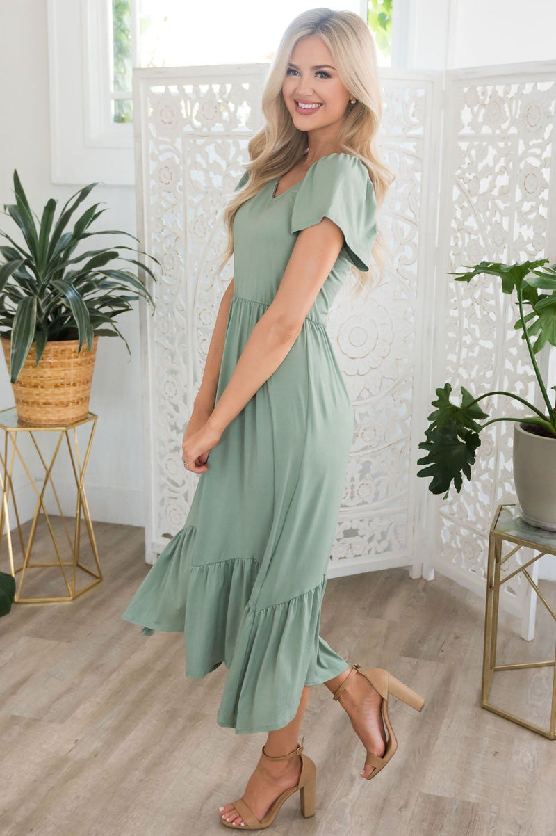 This simple stunner is going to take your breath away! We know the elegant natural waistline, flutter sleeves, and tiered skirt will have you wanting one of these in your wardrobe! The soft sage color is so sweet and feminine too!