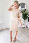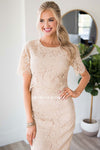 This gorgeous dress features one of our original loves, lace! This stunning dress is made for formal occasions, it is sure to stand out from the crowd! The Berkleigh has the appearance of a two piece set but it is all one piece. This classic cream dress features a floral lace overlay, beautiful eyelash lace hems, half length sleeves, the perfect pencil fit and a knee length skirt. Lined with a back zipper closure.