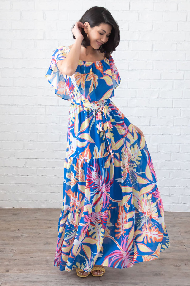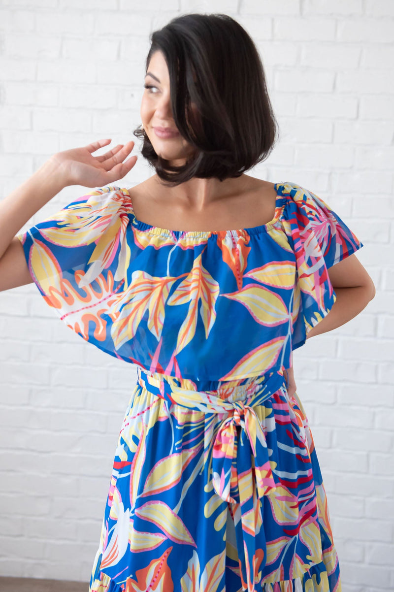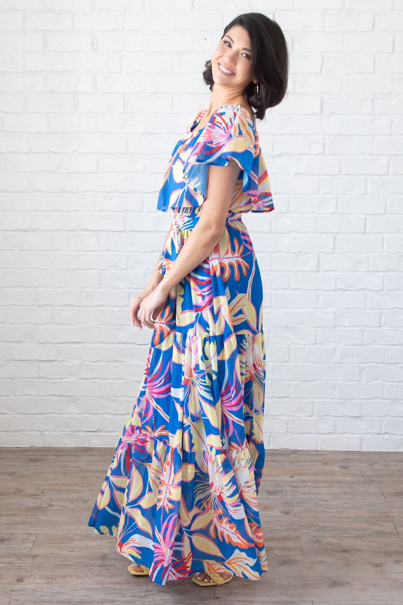 The Bernadene is the most gorgeous floral maxi dress we have ever seen! The lovely blue color paired with the lovely tropical floral is perfect for your summer vacation! Along with the darling tiered ruffle skirt and ruffle bodice, these details are so feminine and classy! Get yours today before these beauties are sold out!