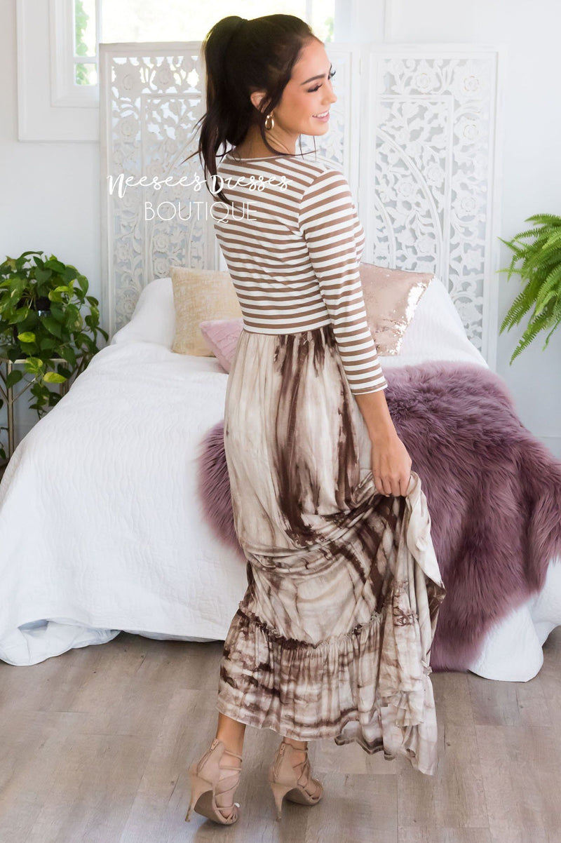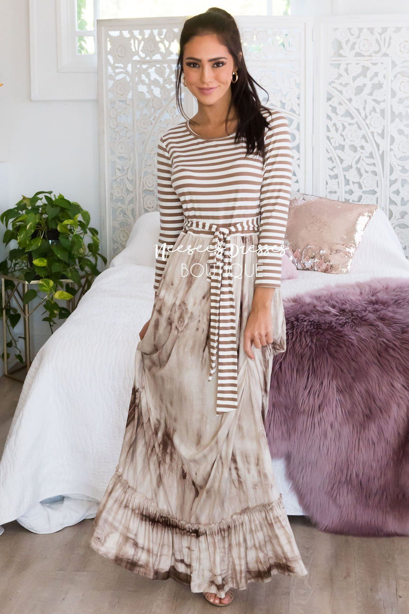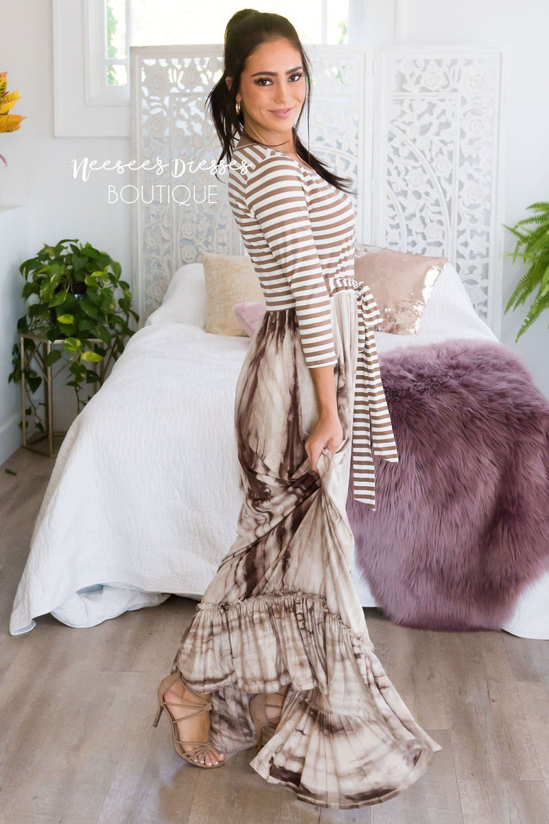 The Bessie is here and we can hardly hold back out excitement! We love the feminine style and flowy ruffle hemline tie dye maxi skirt! Also featuring a modest round neckline, fitted 3/4 length sleeves, elastic waist with tie detail and pockets. Get yours today!