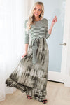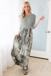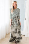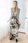 The Bessie is here and we can hardly hold back out excitement! We love the feminine style and flowy ruffle hemline tie dye maxi skirt! Also featuring a modest round neckline, fitted 3/4 length sleeves, elastic waist with tie detail and pockets. Get yours today!