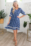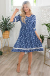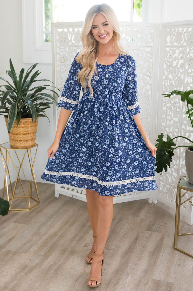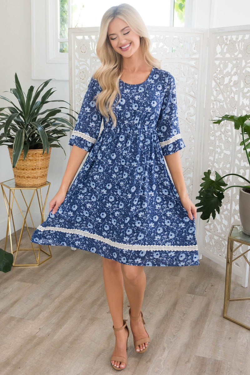 The Bexley Modest Midi Dress is here and ready to steal the show! It has a gorgeous navy and light steel blue floral print, a scoop neckline, and stunning hemline lace detailing on half-length sleeves! We love it and are sure you will too!