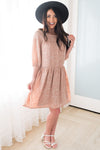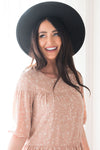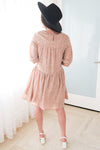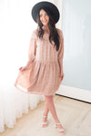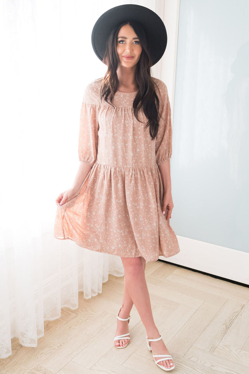 We adore this little floral dress! Featuring the most darling pink sand color with ivory floral print throughout, half length sleeves, an elastic waist, and a gorgeous modest midi length skirt! This dress is seriously so perfect for spring, get yours today!