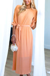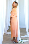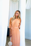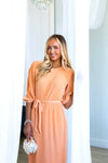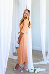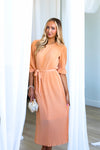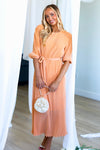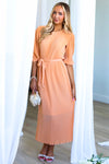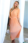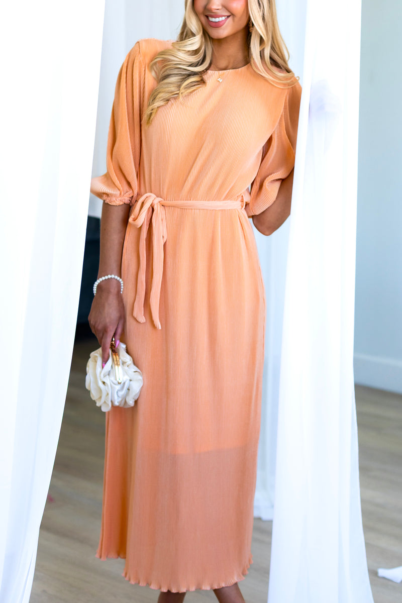 This lovely pleated fabric dress is a Spring must have! Features include a modest round neckline with button back closure, belt tie waistline, darling half length sleeves and the perfect length lettuce edge skirt! Act fast and add to cart before these beauties are gone! This unique peach color won't last long!