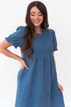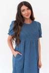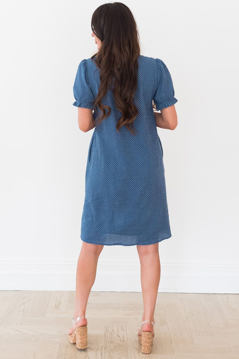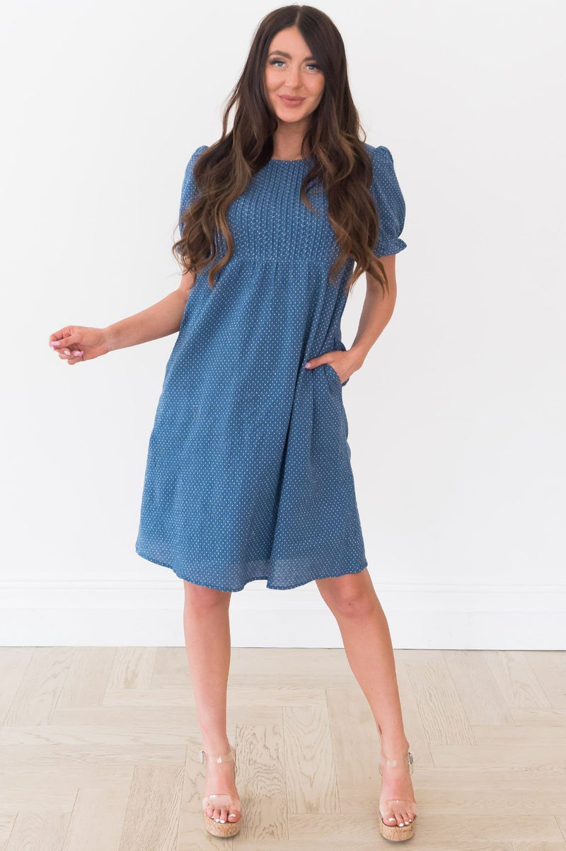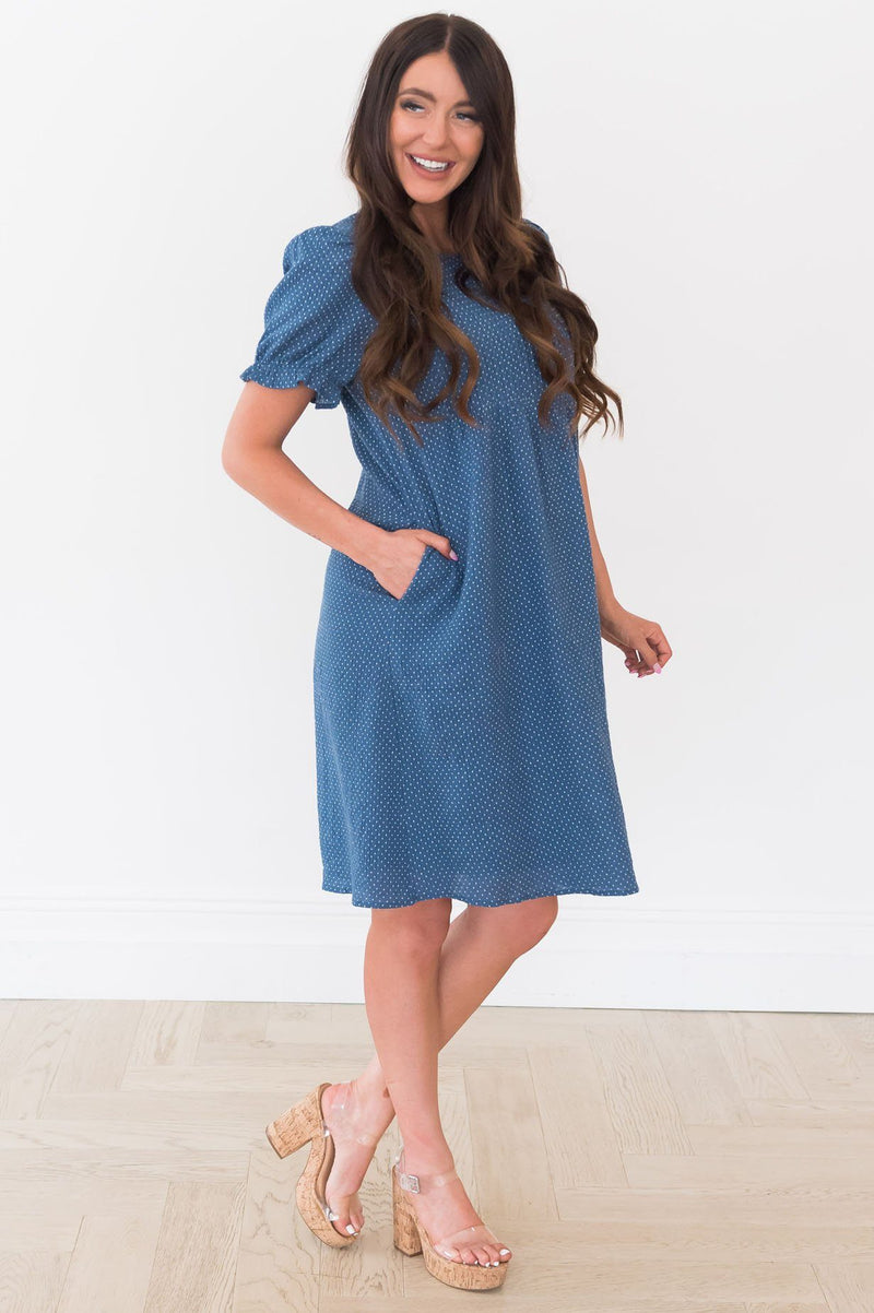 This denim colored dress is just perfect for summer! We adore the simple and delicate polka dot pattern! The modest fit and design features a pleated bodice, puff sleeves with ruffle detailing in hemline and a flowy skirt!