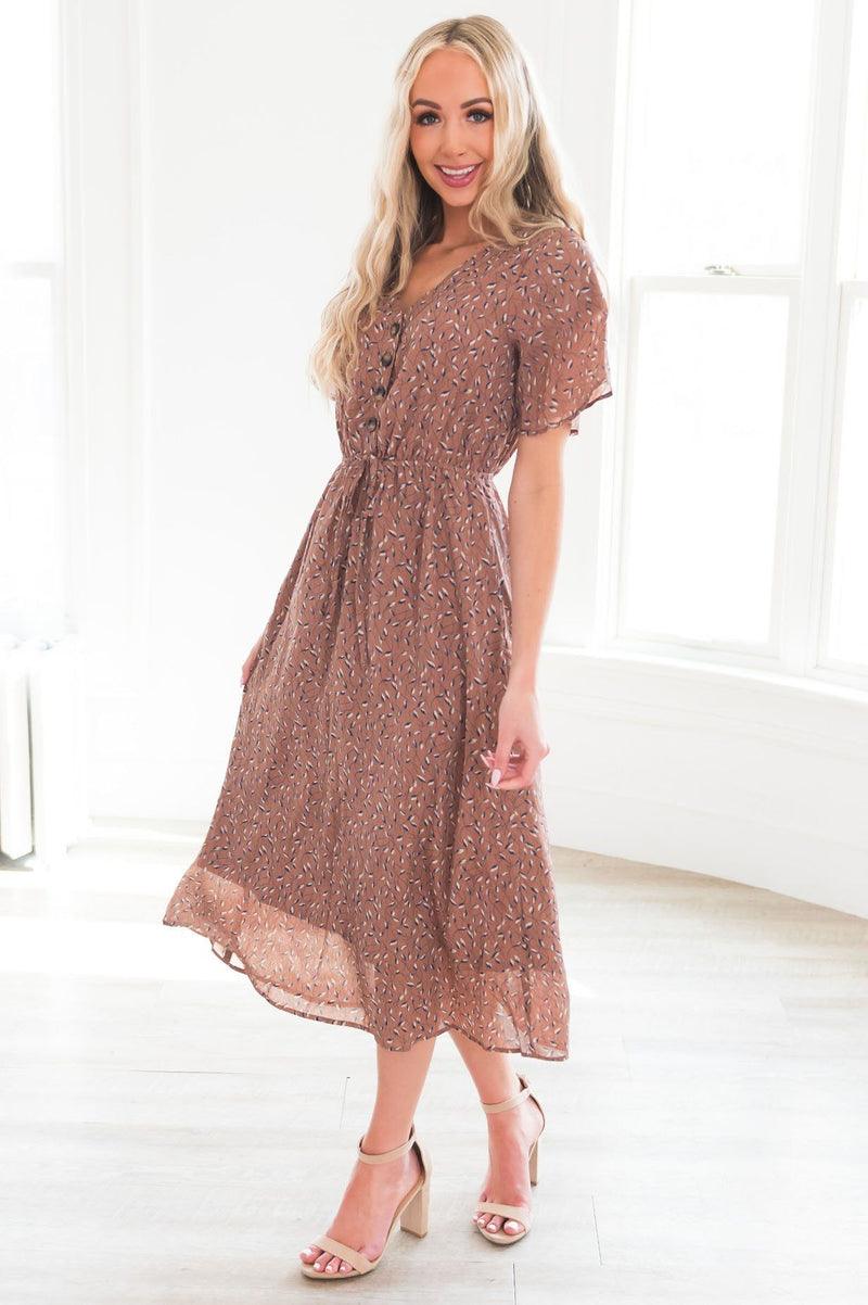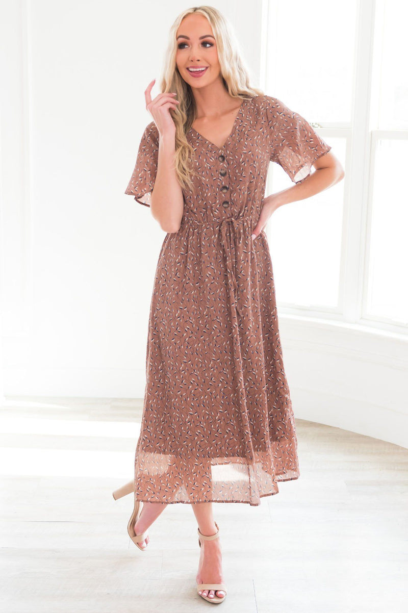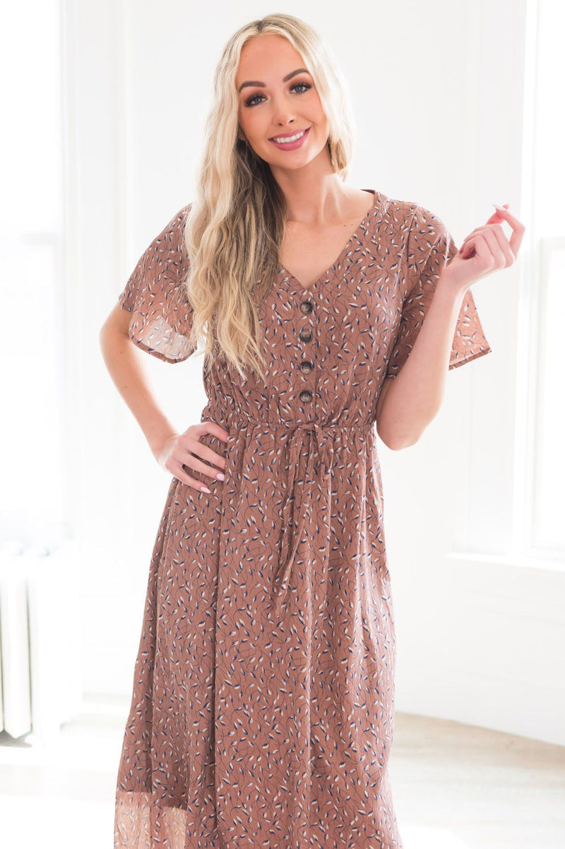 We are pleased to introduce you to a new color of our ever popular Brinn, it's so modest, flowy and feminine, the perfect addition to everyone's closet! Featuring the v-neckline functional button front bodice for our nursing mama's out there. Additional features include short flutter sleeves, elastic waist with faux drawstring tie detail and the loveliest flowy skirt. Just say yes to the dress and get it today!