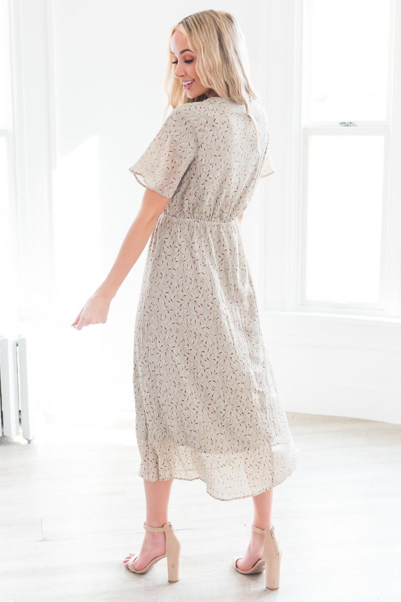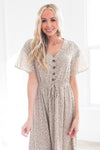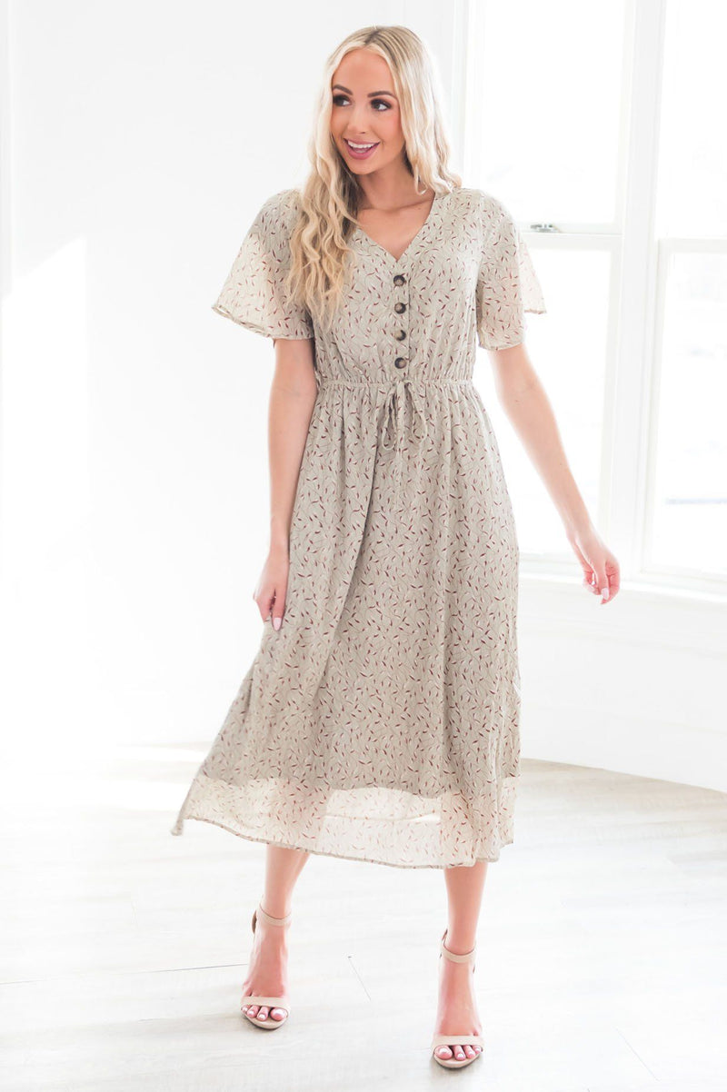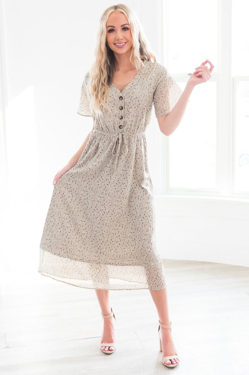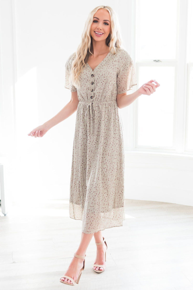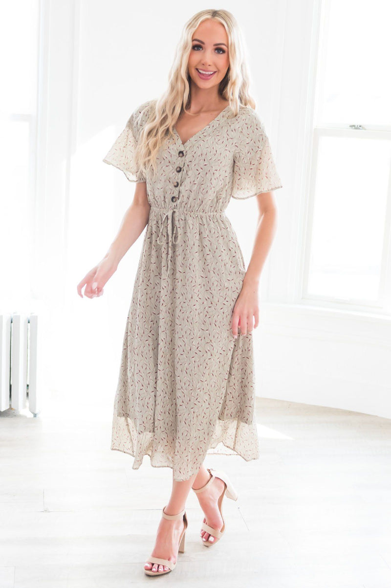 We are pleased to introduce you to a new color of our ever popular Brinn, it's so modest, flowy and feminine, the perfect addition to everyone's closet! Featuring the v-neckline functional button front bodice for our nursing mama's out there. Additional features include short flutter sleeves, elastic waist with faux drawstring tie detail and the loveliest flowy skirt. Just say yes to the dress and get it today!
