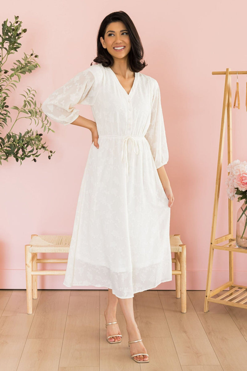 We are pleased to introduce you to our newest favorite dress! The Brinnella, it's so modest, flowy and feminine, the perfect addition to everyone's closet! Featuring the v-neckline functional button front bodice for our nursing mama's out there. Additional features include pretty textured fabric, quarter length sleeves, elastic waist with faux drawstring tie detail and the loveliest flowy skirt. Just say yes to the dress and get yours today!
