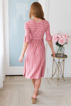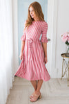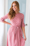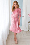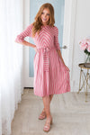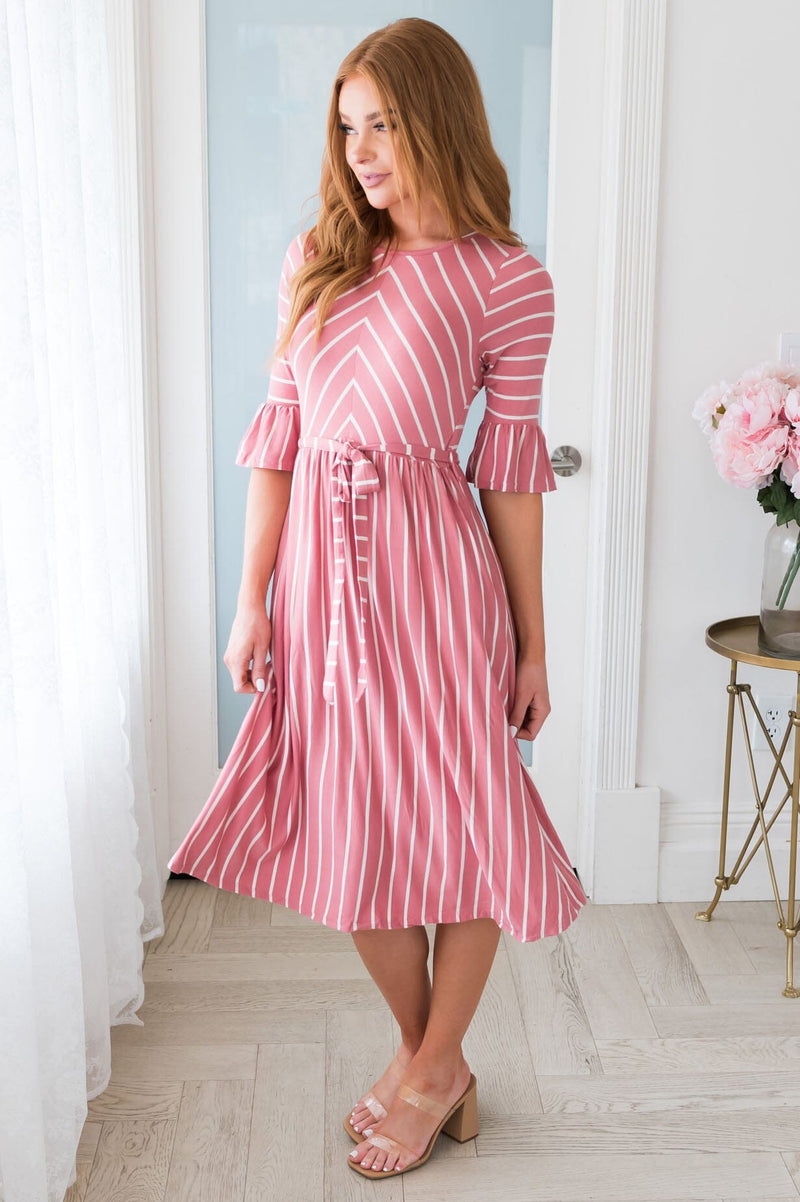 How adorable is our new, modest, Bristol Dress! This cute dress is easy-to-wear and so comfortable. Featuring a round neckline, half bell sleeves, a waist tie, and contrasting stripes.