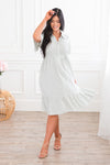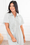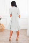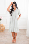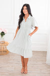 Meet our new, modest, Brooklyn Dress. This dress will have you ready for all things Spring! Light weight, and cute as can be, this dress features a collared neckline, button bodice ideal for nursing mothers, a cute textured bodice, pockets and a ruffle tiered skirt.