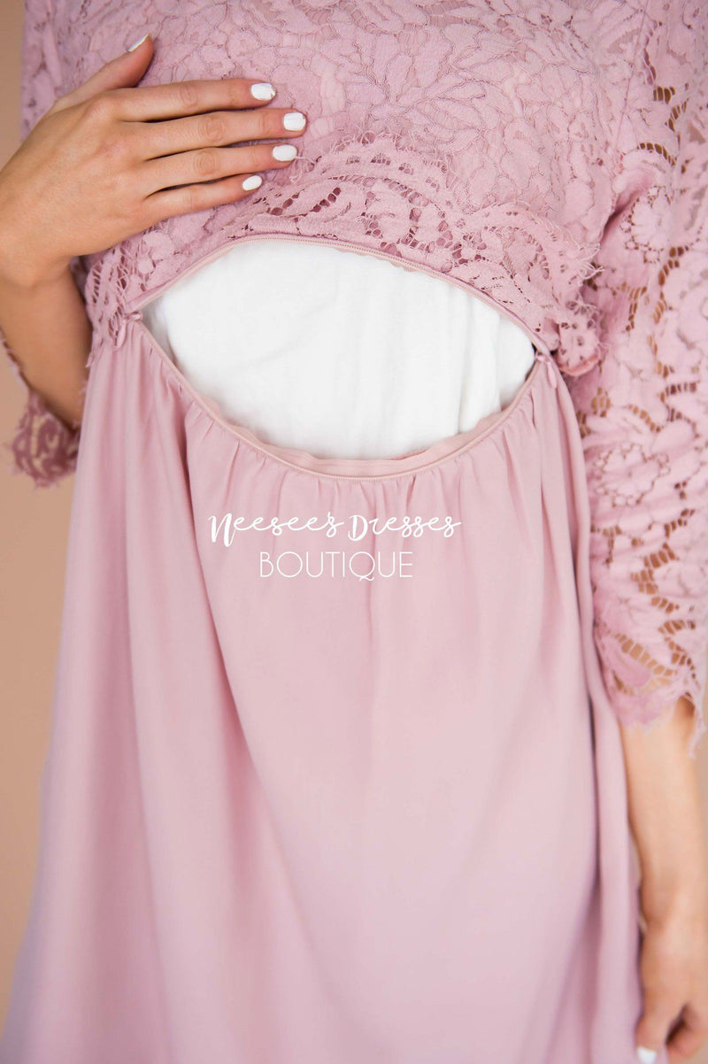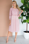 Current Mood- Obsessing over this stunning new dress! From the delicate lace details, to the flattering fit, there is nothing not to love about this dress! Plus, this dress features an open zipper under the bodice making this dress perfect for our nursing mothers! Our beautiful Brynn Dress features a lovely lace bodice with scallop edges, a rounded neckline with scallop detailing, 3/4 length sleeves and a knee length skirt.