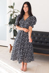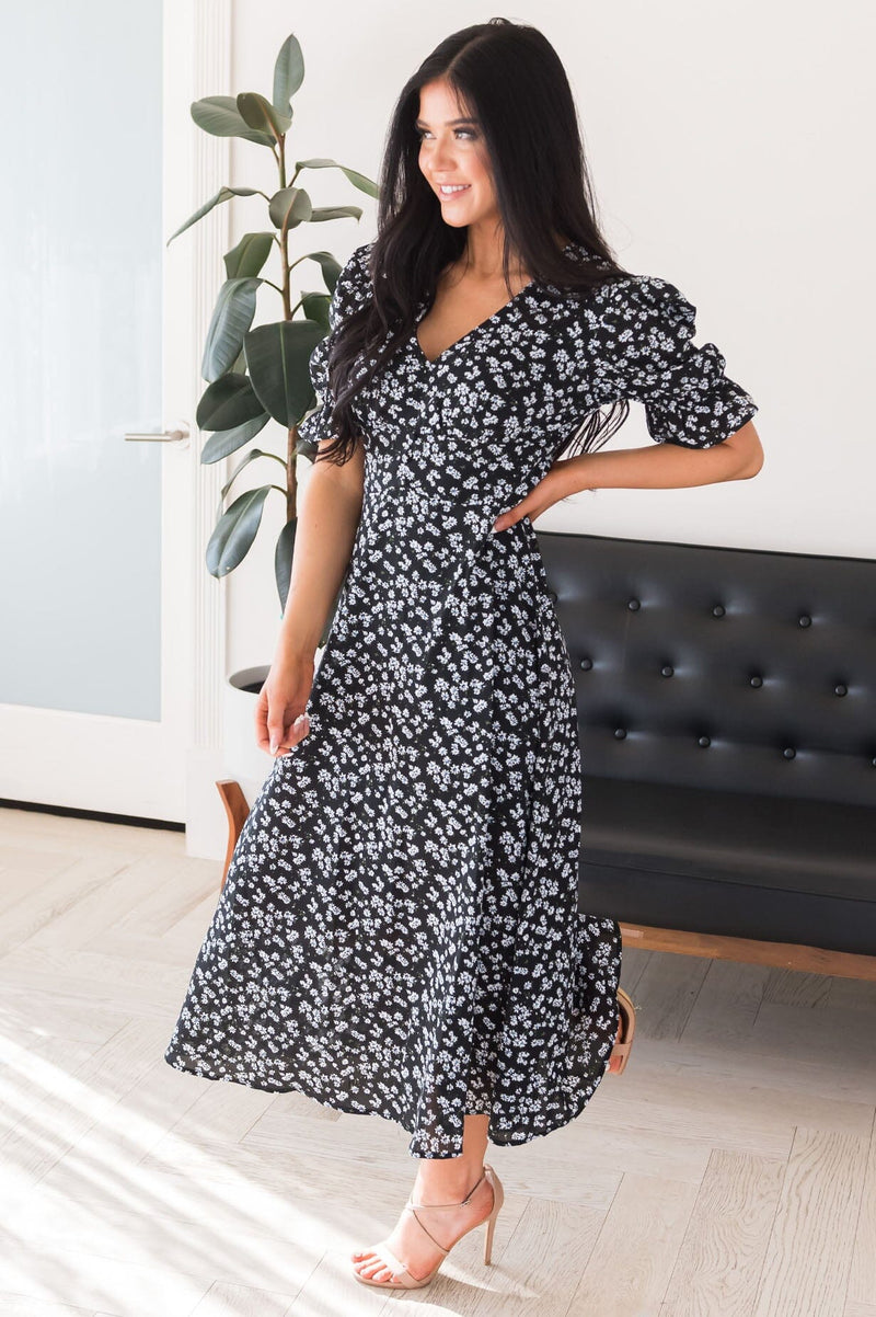 As sweet as can be, the darling Cabrielle has your name written all over it! Featuring short ruffled puff sleeves, faux button front bodice, flowy tea length skirt and the sweetest daisy floral print.