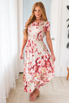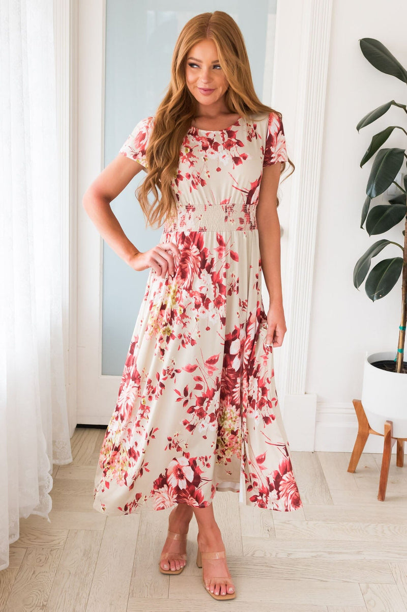 It was sheer floral love at first sight! The sweetest little Caitriona dress is one you need to add to your wardrobe now! Featuring an lovely round neckline, cinched smocked waistline, short sleeves, & the most feminine modest side slit skirt. Get yours today, we promise this one will go fast!