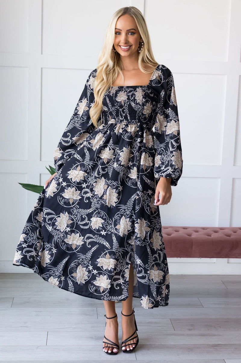 The Cambrey is the dress fairytales are made for! This lovely floral has a squared neckline, smocked bodice, long sleeves, slip on style and such a gorgeous feminine modest slit skirt. It is an exceptional dress and you must grab yours today!